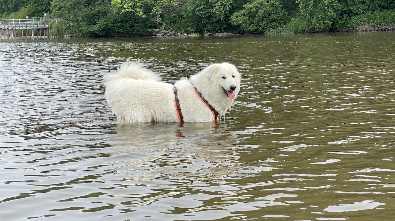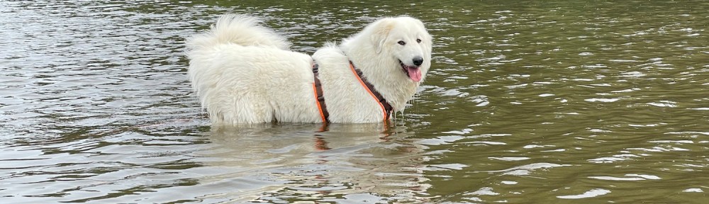 Aber zuvor bin ich mit meinem großen Mensch am großen Fluß mit dem komischen Namen gewesen. Und da bin ich gleich rein. Zum Baden! Die Bella geht gerne ins Wasser.