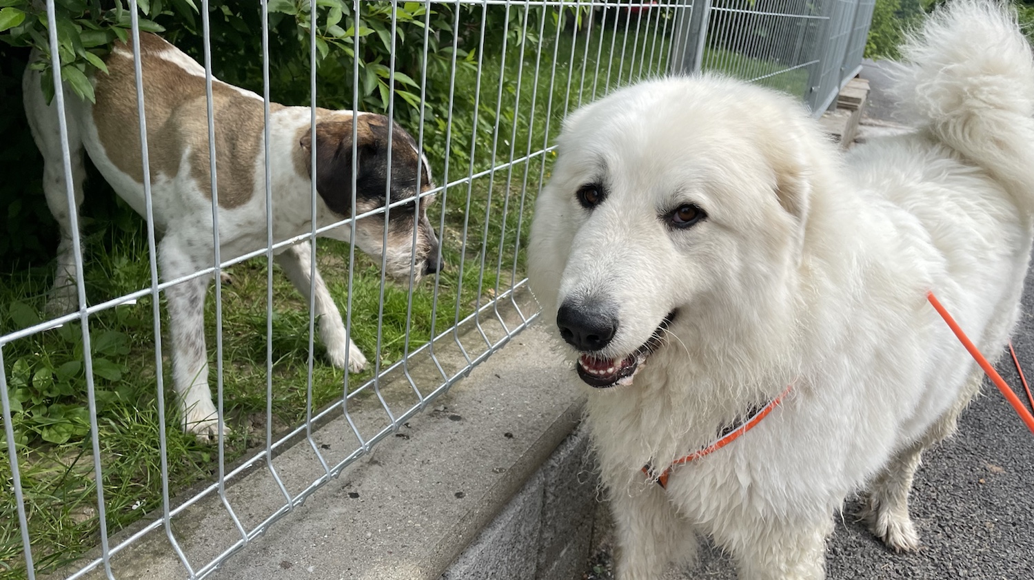 Da habe ich den Kalle getroffen. In seinem Garten. Der war wieder ganz aufgeregt und wir haben uns angeschnuffelt. Auf dem Heimweg auch gleich nochmal.