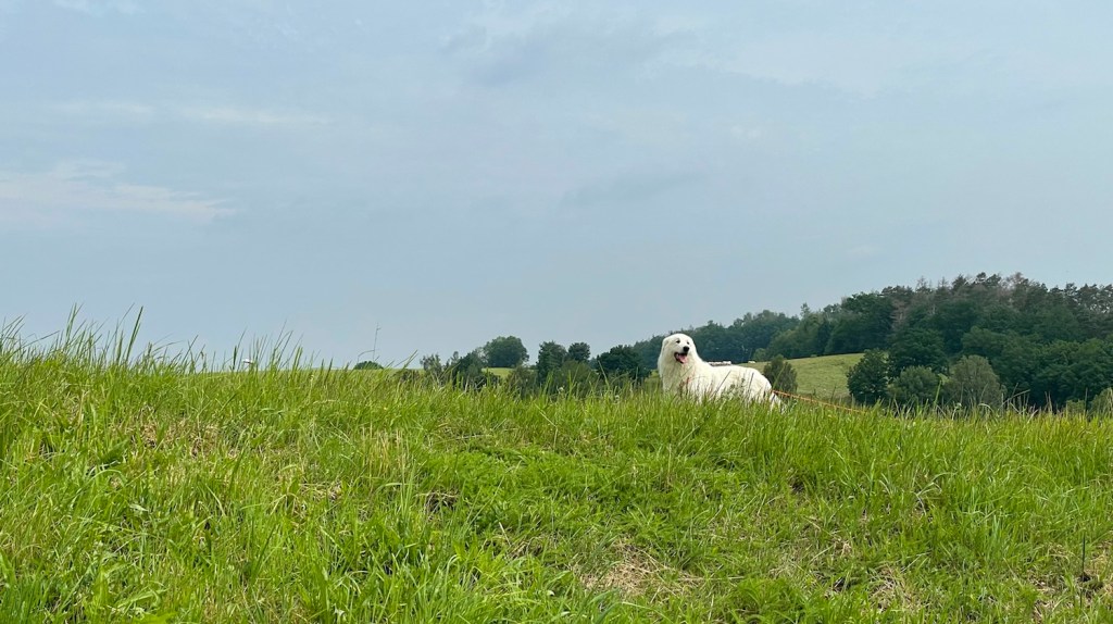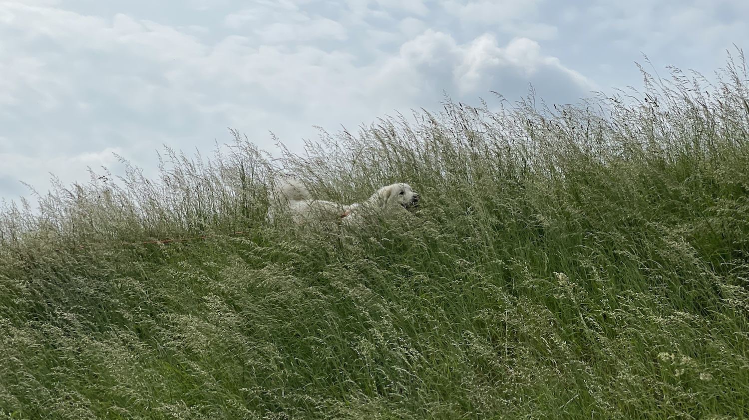 Wir sind dann spazieren gegangen. Zuerst zum großen Feldweg und da habe ich überall geschnuffelt. Bis nach Kockisch sind wir gewandert.