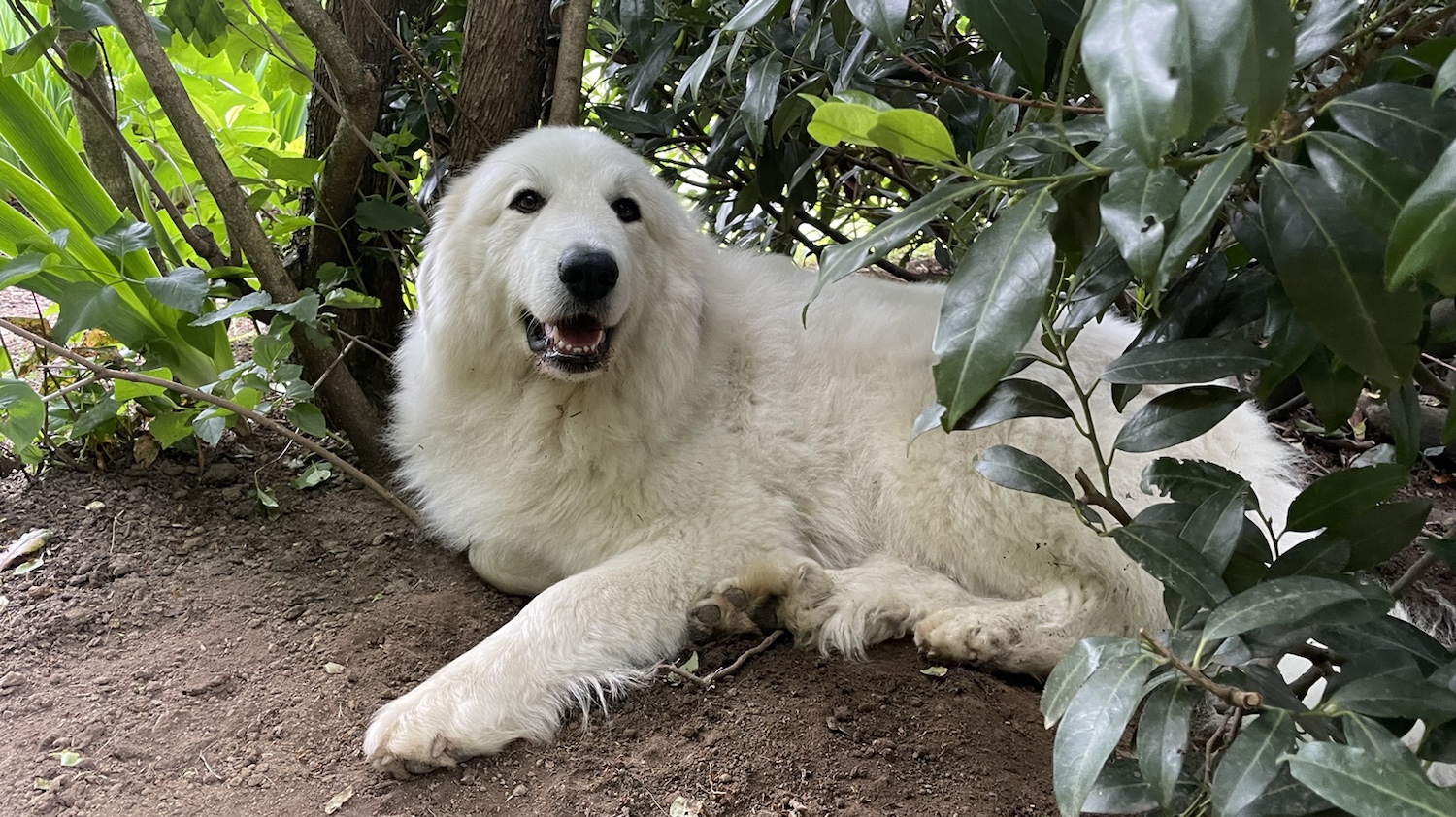 Ich habe mich in meinem Garten unter meinen schönen Kirschlorbeer gesetzt. Da habe ich eine schöne Kühlgrube gebuddelt und meine liebe Sonne macht mir Schatten und wenn es regenwettert werde ich nicht naß und kann außerdem noch meinen Garten bewachen.