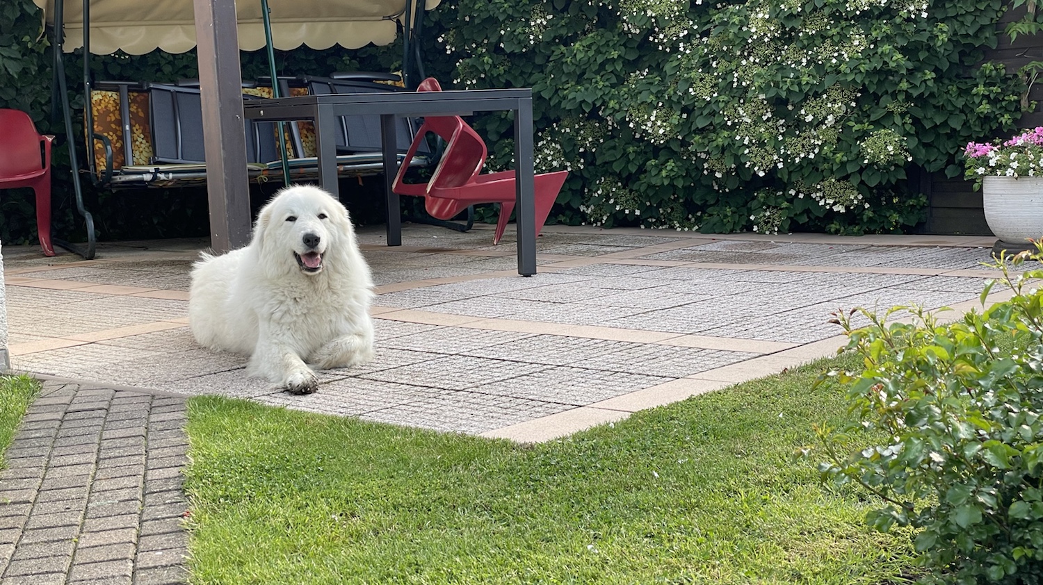 Und auf meiner Terrasse habe ich auch noch gelegen. Abends. Da habe ich auf meinen Abendspaziergang gewartet. Der war heute spät. Ich bin mit meinem großen Mensch durch die Siedlung gelaufen. Und da war ich noch beim Aaron. Der durfte nochmal raus, weiiil, der hat nämlich schon geschlummert.
