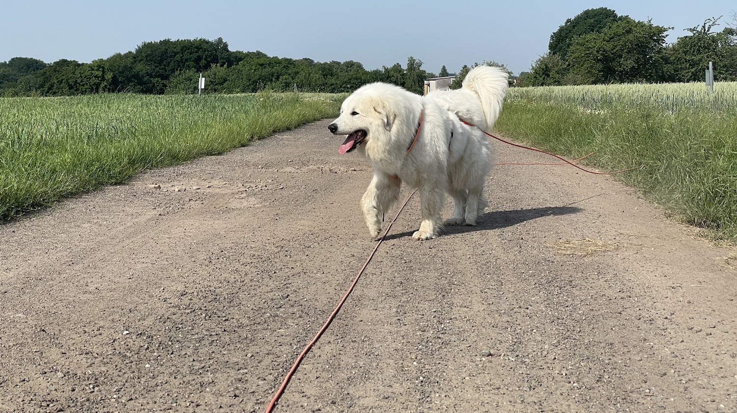 Und dann haben wir unseren Morgenspaziergang gemacht. Heute nur einen kleinen, weiiil, es ist doch so warm. Und da sind wir gleich losgestartet und zum großen Feldweg gelaufen und dann immer weiter bis nach Kockisch.