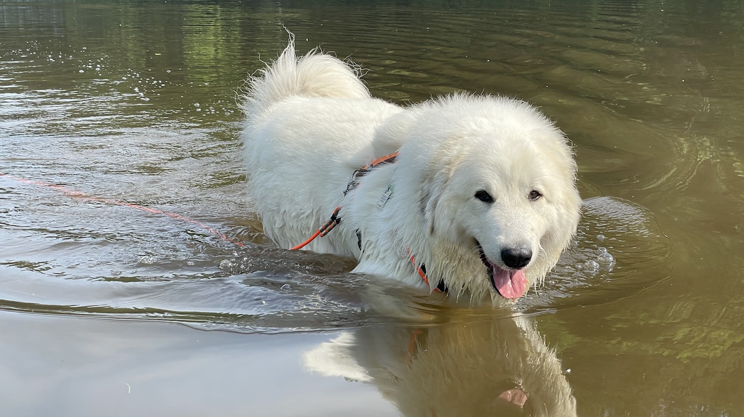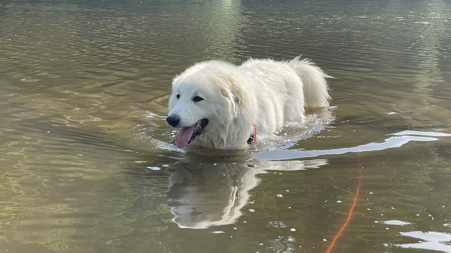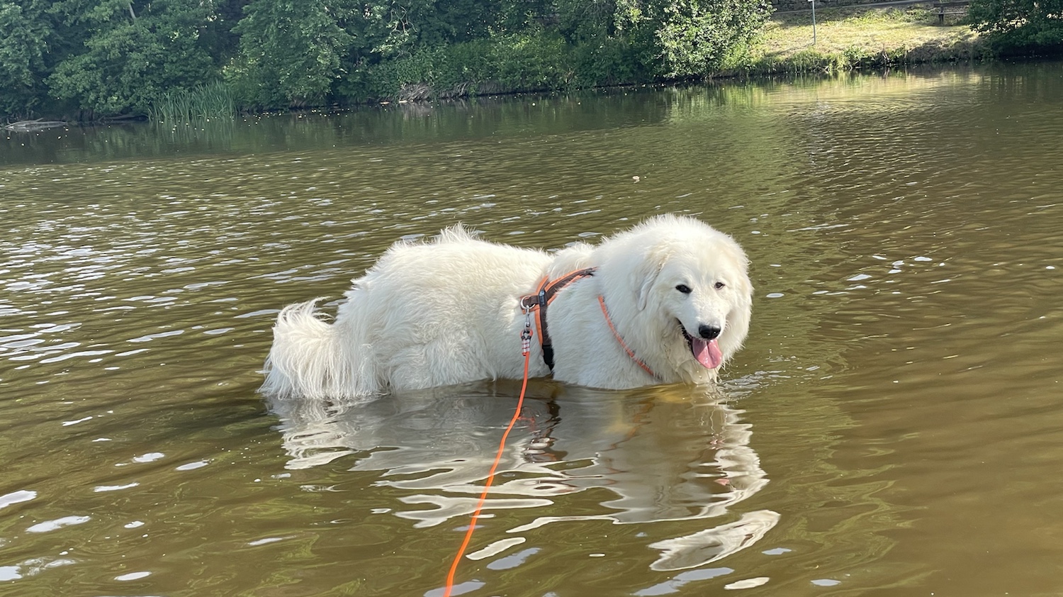 Wir sind deshalb wieder zurück und haben die beiden Schäferhunde getroffen. Die waren fertig und haben die Badestelle extra für die Bella frei gemacht. Das ist ganz lieb. Und so konnte ich schön baden gehen.