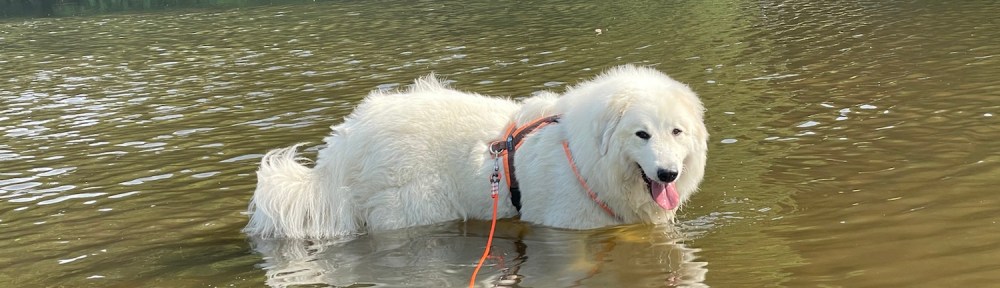 Der Kalle hat bestimmt noch geschlummert. Und wir sind an den großen Fluß mit dem komischen Namen gegangen. Die Badestelle war aber besetzt. Da war der große Schäferhund drin, der die Bella mal überfallen wollte. Und noch ein kleinerer.