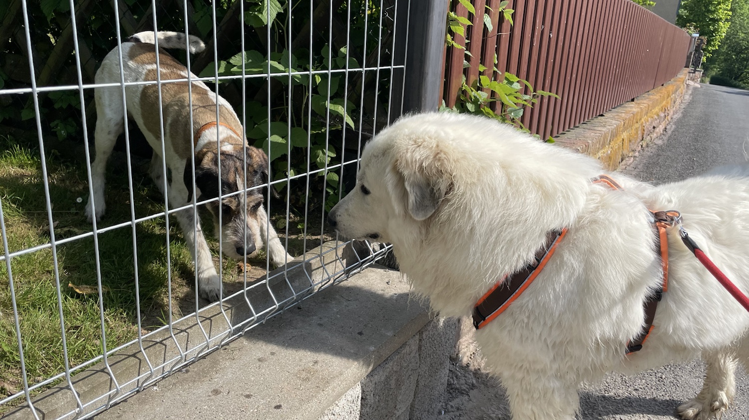 Danach sind wir wieder durch Kockisch gelaufen und diesmal habe ich den Kalle in seinem Garten getroffen. Wir haben uns wieder durch den Zaun angeschnuffelt.