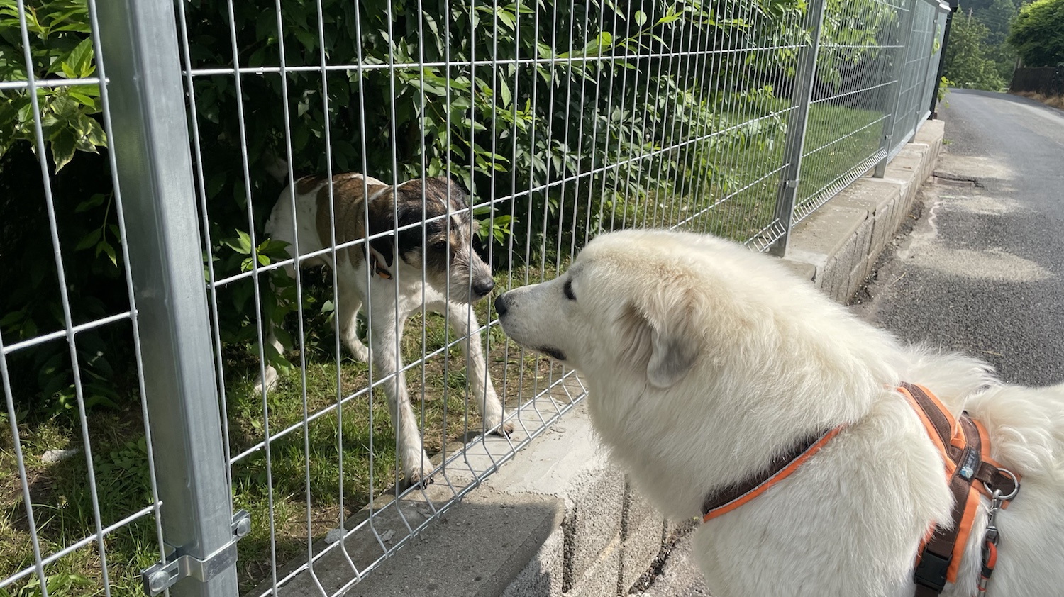Gleich nach dem Grillieren habe ich mit meinem großen Mensch meinen Abendspaziergang gemacht. Durch mein Wohngebiet. Da haben wir heute zwei Mietzekatzen getroffen. Und einen kleinen Hund. Der war ganz süß und ganz lieb. Bin ich auch! Ich bin eine Pyri, ich bin ziemlich groß.