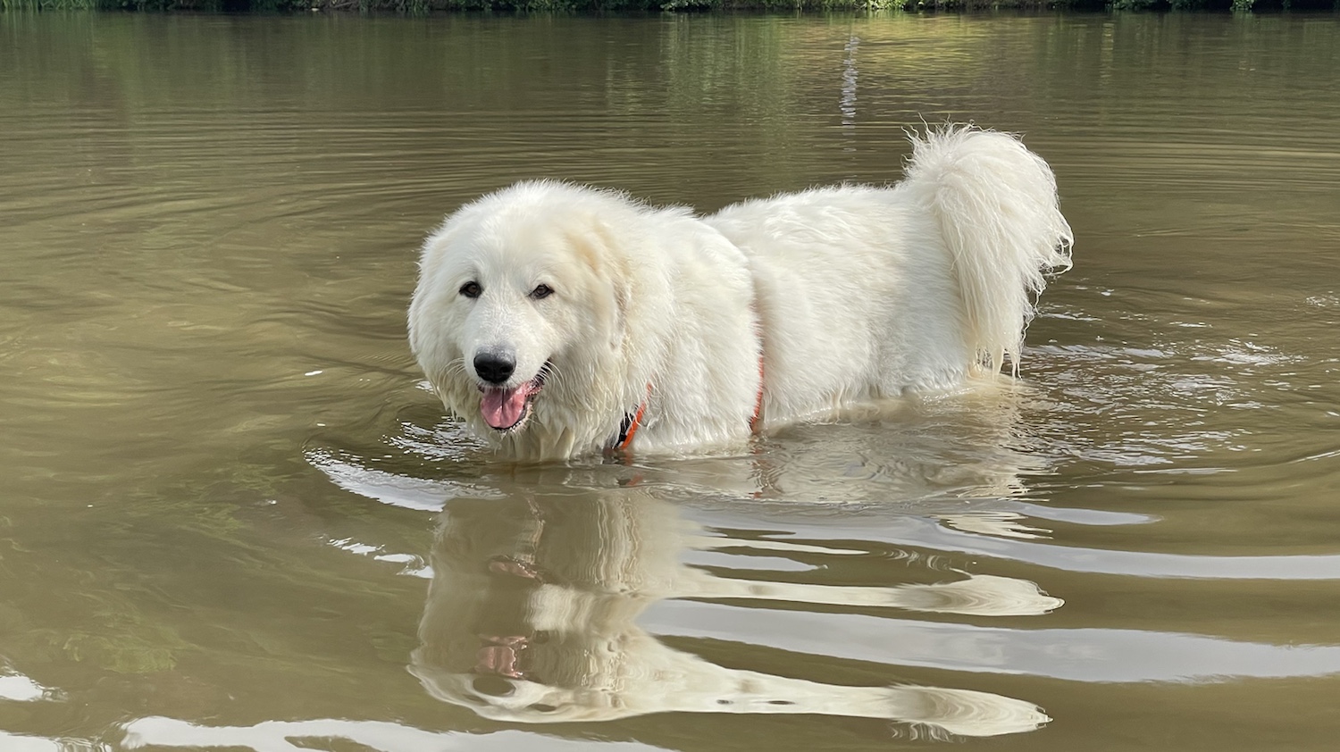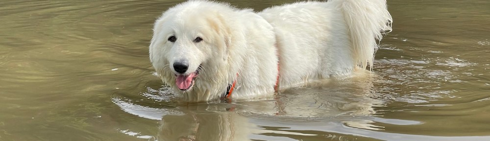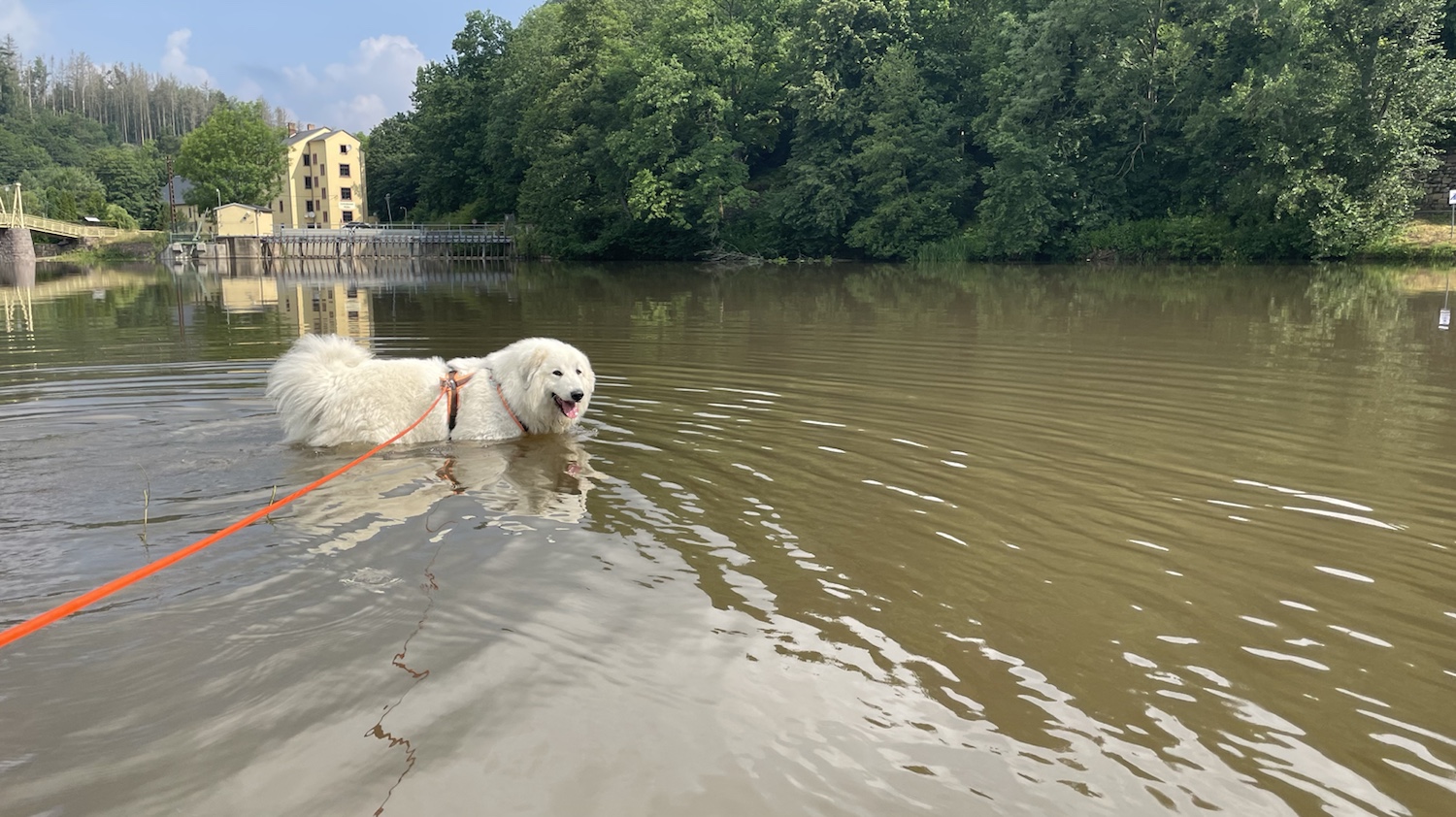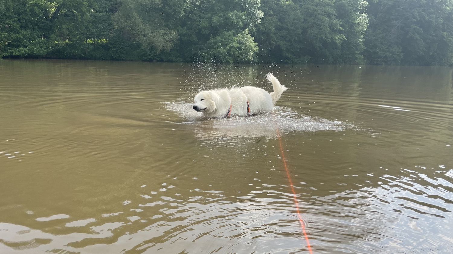 Vom Kalle sind wir dann an den großen Fluß mit dem komischen Namen gegangen. Und ich bin gleich rein ins Wasser. Das war heute gar nicht schön klar, sondern ganz braun. Weiiil, es hat geregenet, sagt mein großer Mensch.