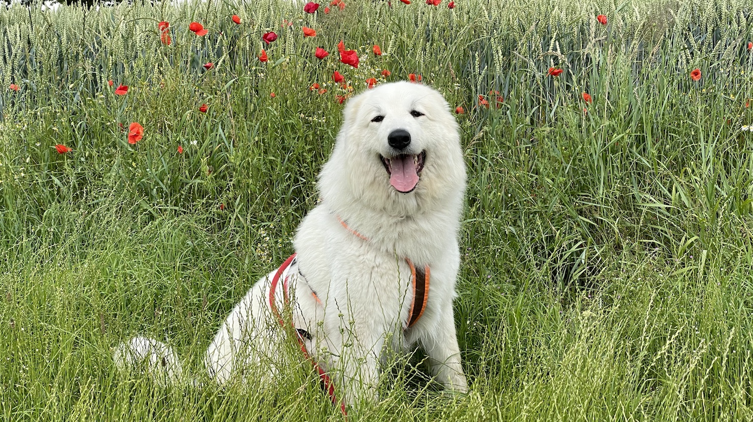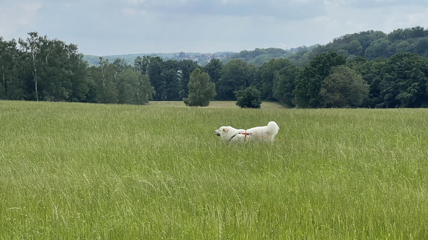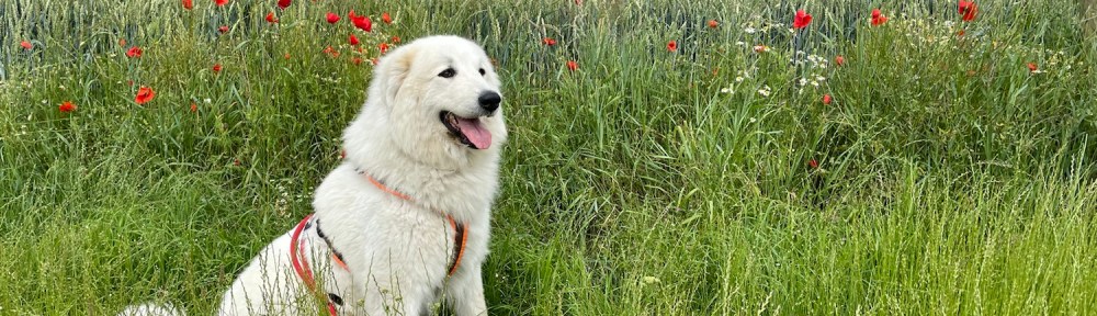Und danach bin ich durch das hohe Gras geflitzt. Das war so schön. Ich mag doch so hohes Gras. Mein großer Mensch ist in der Traktorspur gelaufen. Der ist ein Trampel und latscht sonst alles kaputt. Das sagt man so.