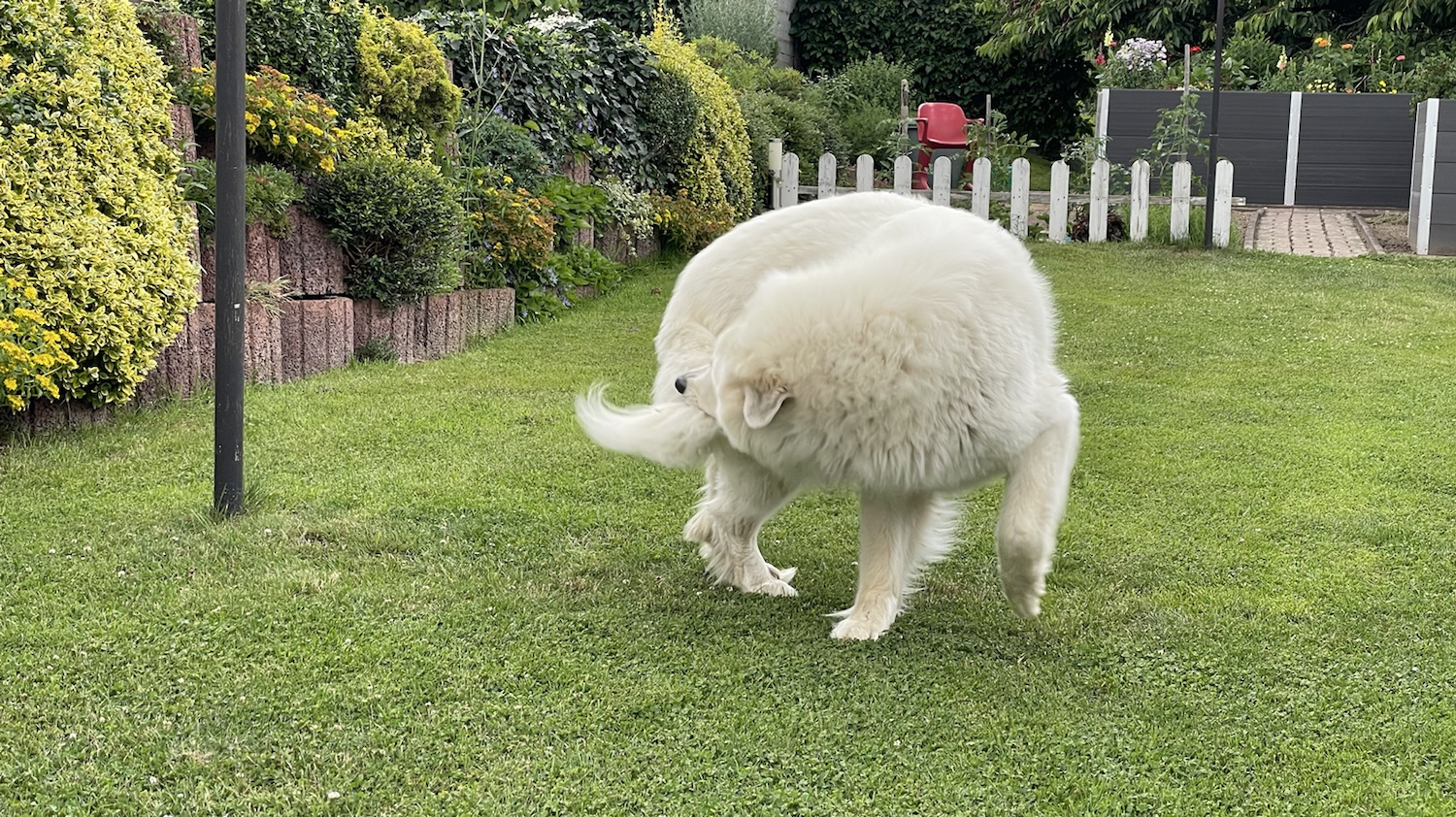 Vor meinem Abendspaziergang habe ich noch mit meinem großen Mensch im Garten gekaspert. Das war lustig. Da bin ich ganz wild.
