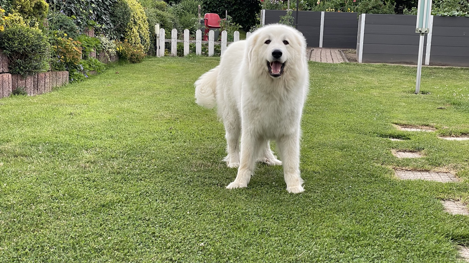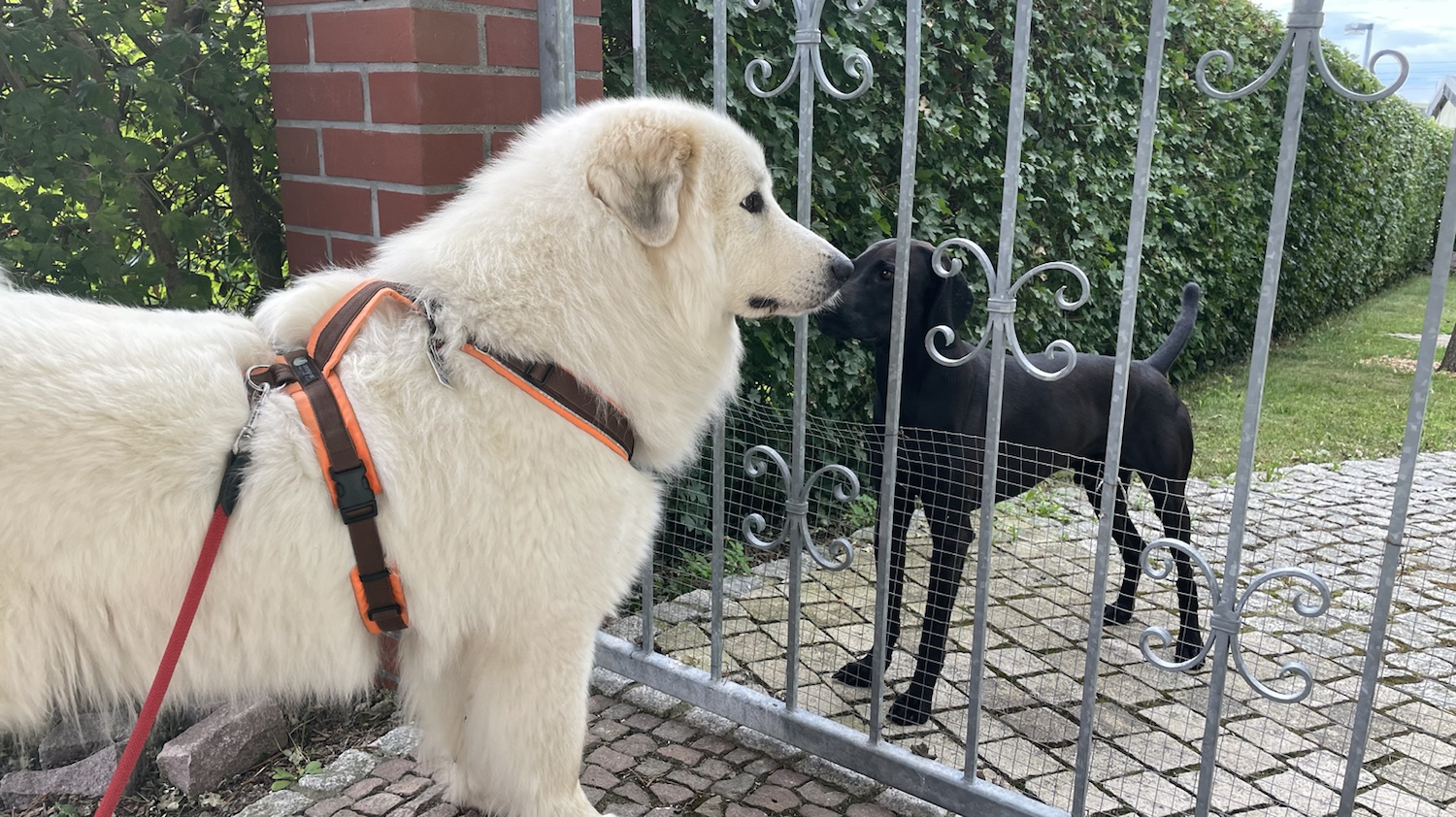 Und dann sind wir beim Aaron am Garten vorbei. Und da war der Aaron in seinem Garten. Und ich habe mich natürlich gefreut. Wir haben uns am Gartentor wieder angeschnuffelt. Der Aaron ist nämlich ein Junge.