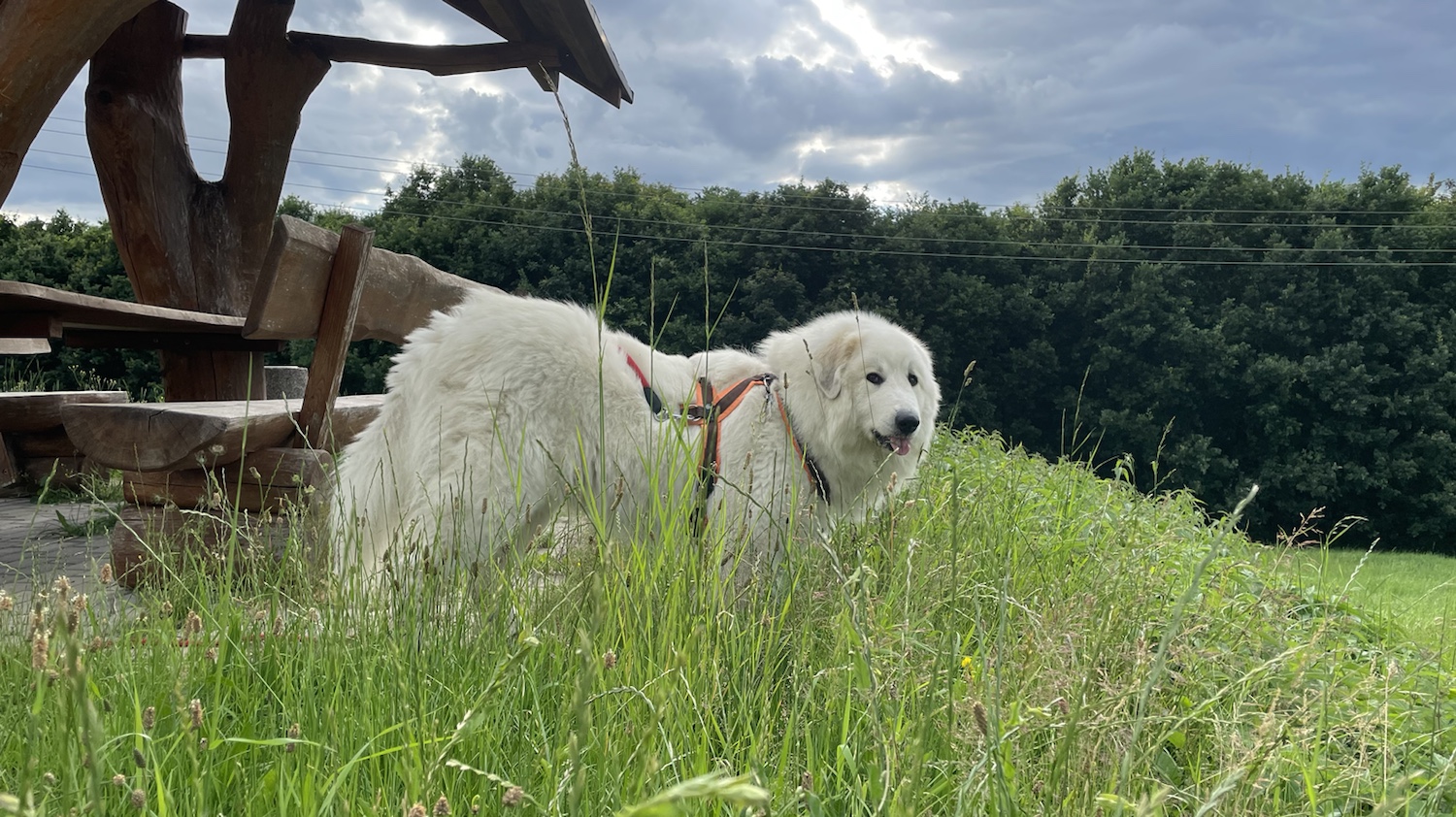Heute war es den ganzen Tag wolkig. Da ist es für die Bella nicht zu warm gewesen. Ich habe schön meinen Garten bewacht. Und mit Menschenopi und Menschenomi gekuschelt. Auf meiner Terrasse. Da ist es am kühlsten.