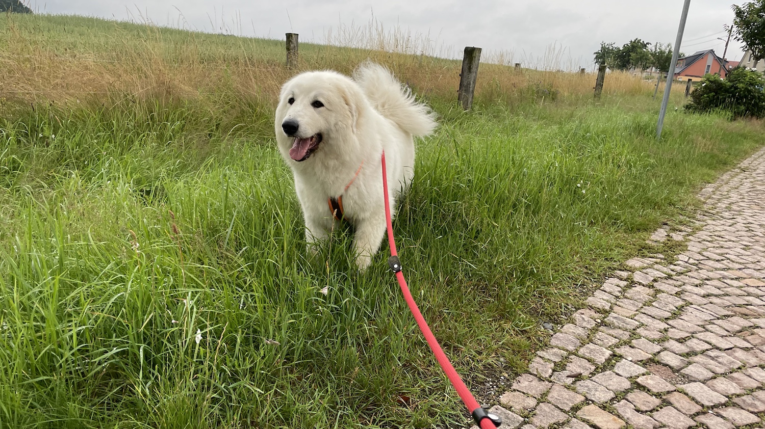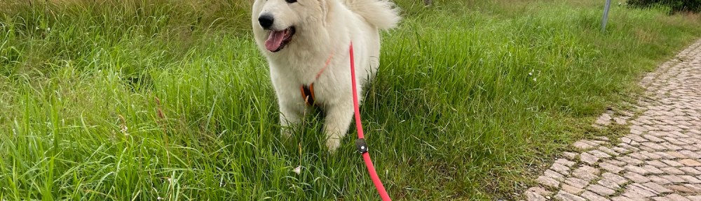 Heute hatten wir einen Abenteuerspaziergang. Einen ganz gefährlichen. Zuerst ging alles ganz normal los und wir sind in die Siedlung gegangen. Ich habe wieder überall schön geschnuffelt. Das war heute spannend, weiiil, es hatte immer mal geregenwettert und da riecht alles ganz anders als sonst.
