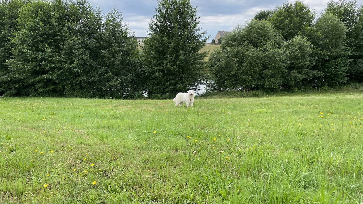 Dann bin ich mit meinem großen Mensch losgewandert. Wir sind durch mein Wohngebiet gegangen und zur großen Wiese hinter meinem Wohngebiet. Da konnte ich schon mal schön schnuffeln.
