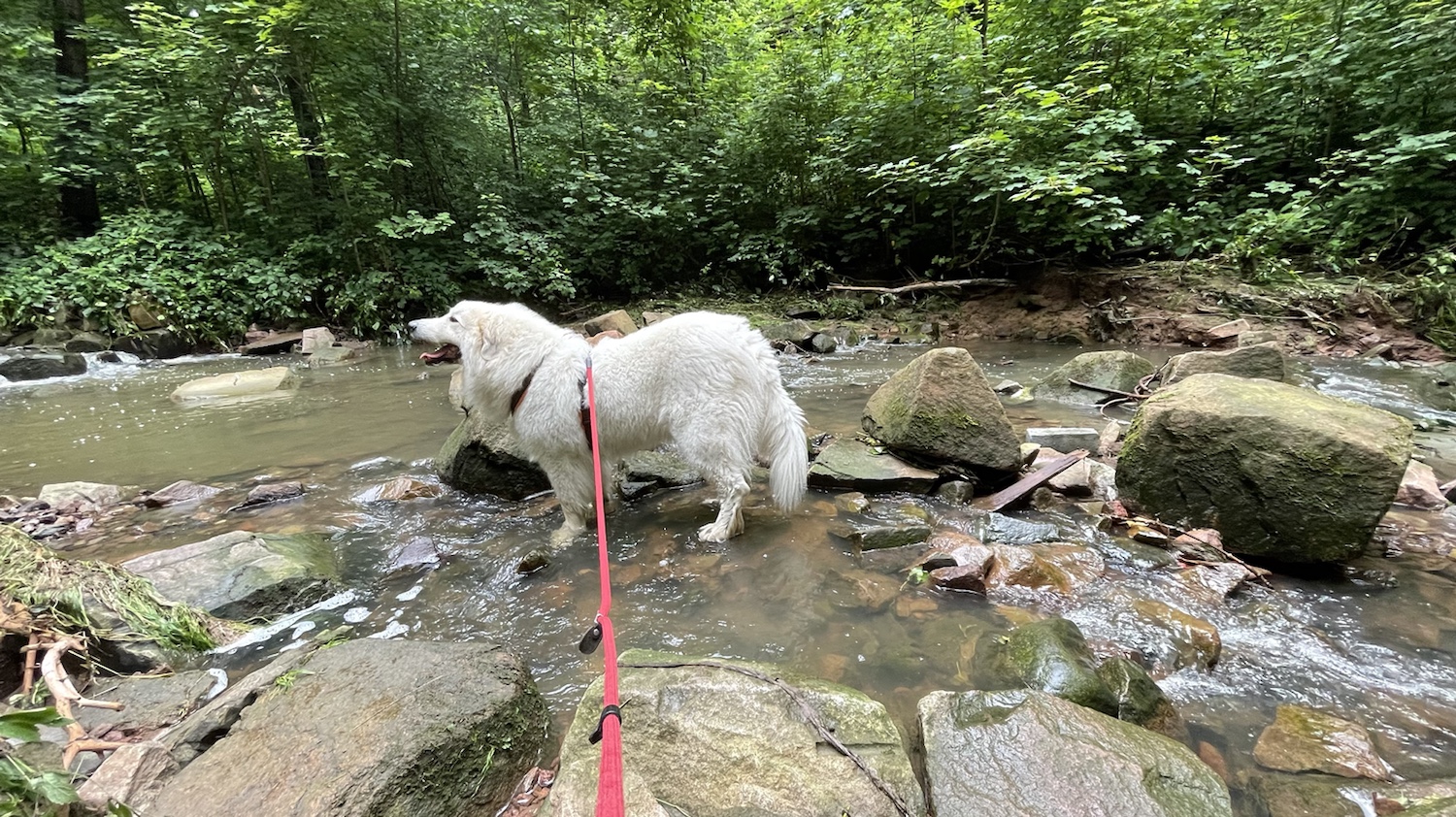 Wir sind bis an die Tschooo-Pauuu, den großen Fluß mit dem komischen Namen, gelaufen und dann beim Spike vorbei. Der Husky war aber heute nicht in seinem Garten.