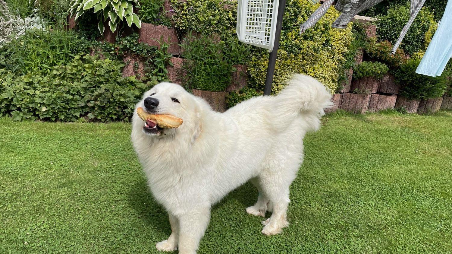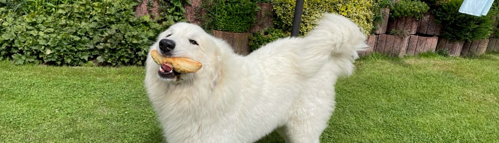 Nachmittags haben meine großen Menschen wieder in meinem Garten gebaut. Meine große Menschin hat um meine Rosen einen schönen Rand gebaut und mein großer Mensch hat noch eine Leine für den Rasenhund in der Wiese verbuddelt. Ich soll die Leine nicht wieder ausbuddeln. Sagen meine Menschen. Das habe ich schon mal gemacht. Da war ich noch klein. Das ist eine ganz schön schwere Arbeit für eine kleine Pyrenäenberghündin.