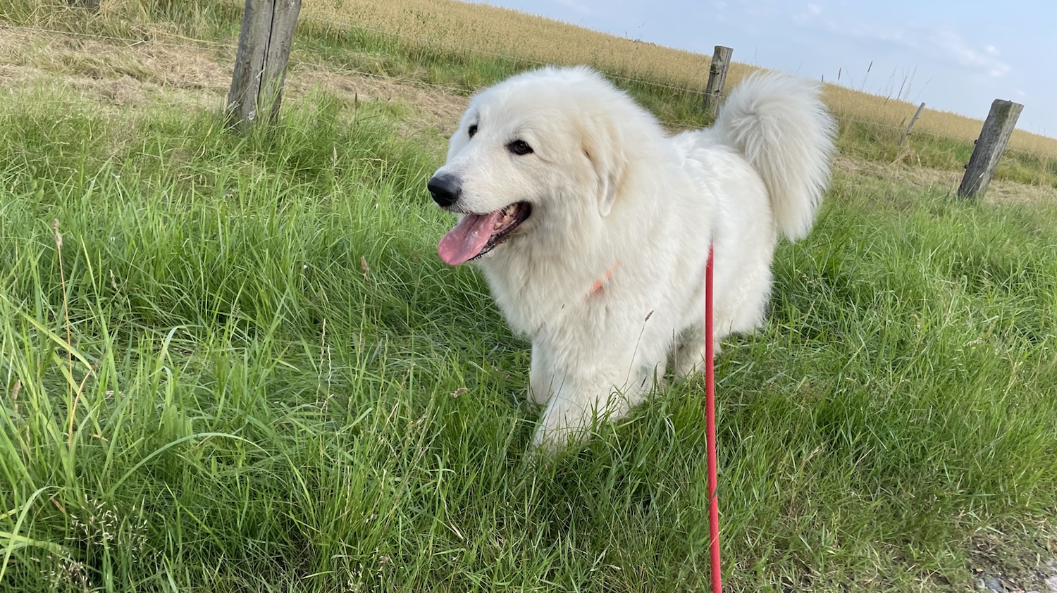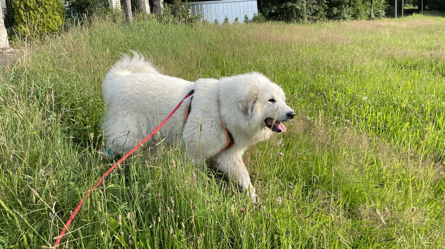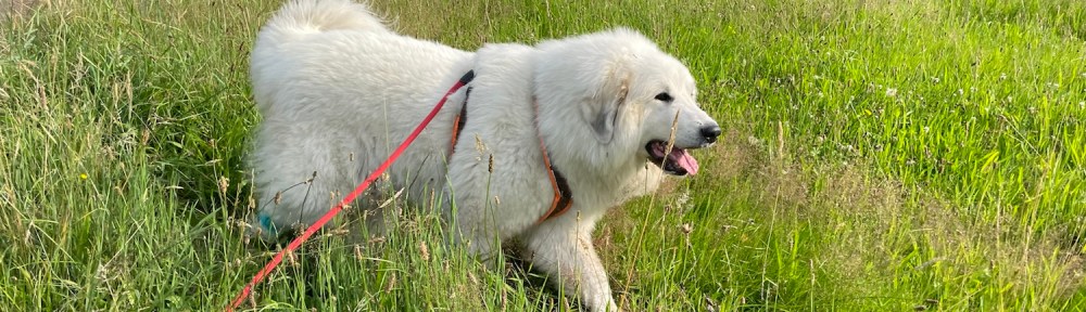 Und dann sind wir abendspazierengegangen. Zuerst wieder in die Siedlung. Mein großer Mensch hat gesagt, die Bella darf führen. Ich kann das. Ich bin eine Herdenschutzhündin. Eine Pyri bin ich.