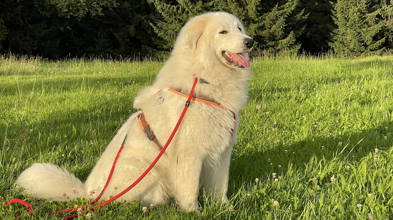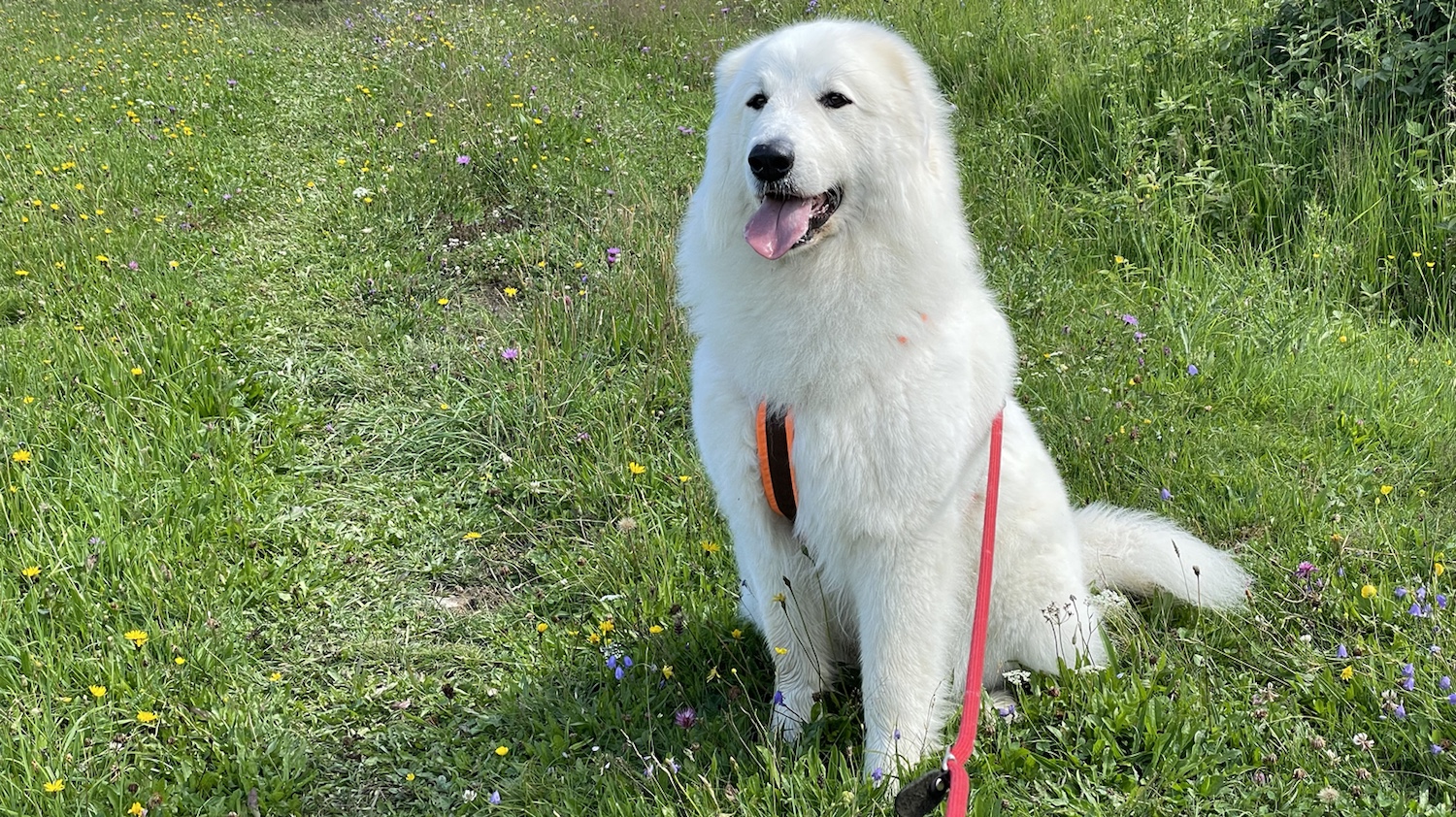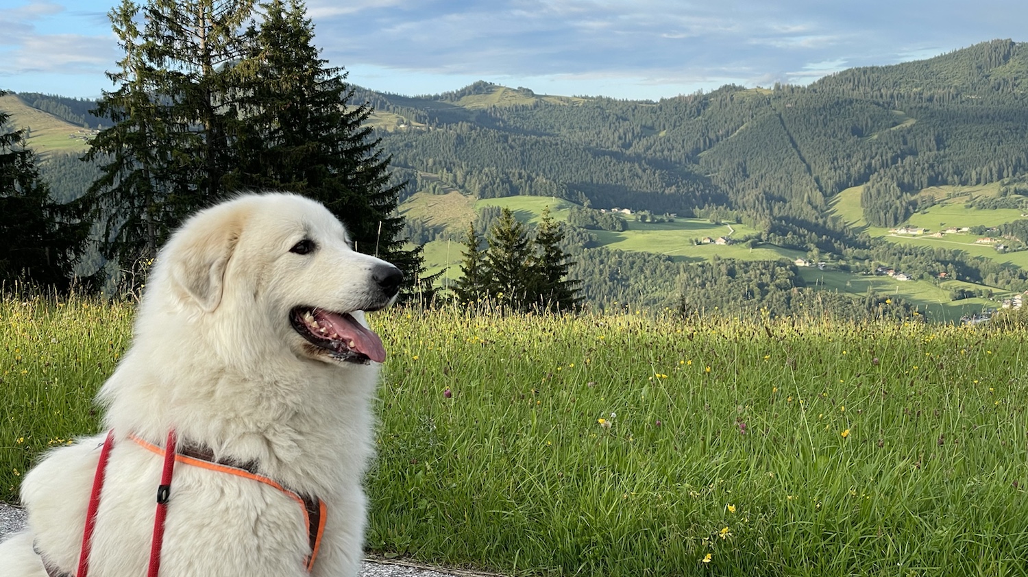 Nach dem Frühstücksfuttern haben wir einen kleinen Spaziergang gemacht. Den Weg hinter unserem Ferienhaus lang. Heute war da keine Wolke und man konnte ganz weit gucken. Sogar bis hinter die Berge. Wir sind heute an dem Haus am Ende der Straße vorbei, ein Stück am Wald lang und dann über eine wunderschöne Wiese. Die Bella ist eine Pyrenäenbergwaldfeldundwiesenhündin 🐾🐶🤣😂🤣🐶🐾.