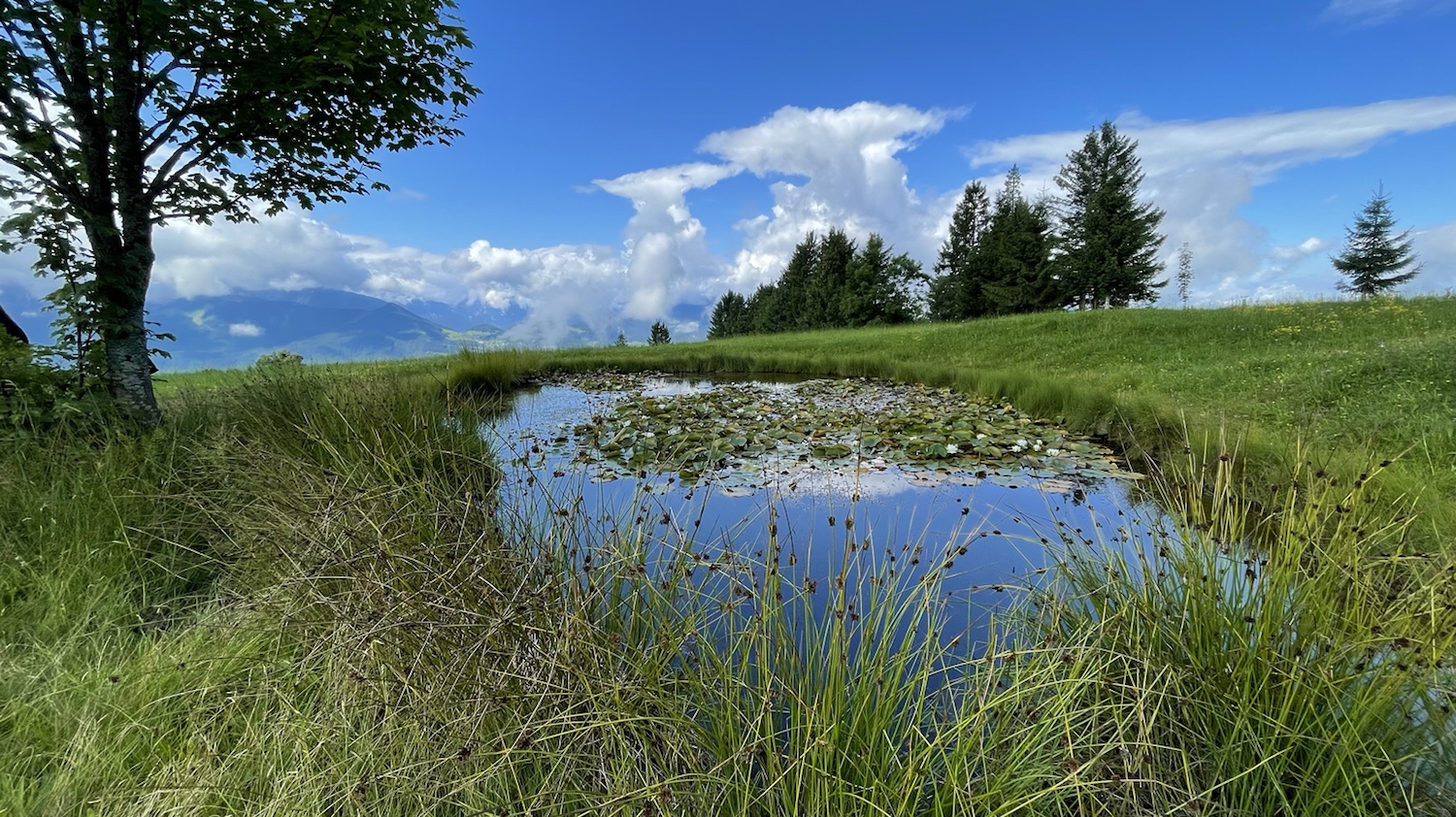 Heute laufen wir eine erste kleine Runde in der Umgebung. Gleich hinter dem Haus geht ein Weg zu den Wiesen. Wir laufen bis an einen kleinen Weiher, auf dem herrliche Seerosen gerade blühen. Wir laufen auf dem Wanderweg weiter, müssen aber dann umkehren, da der Weg abgesperrt ist.