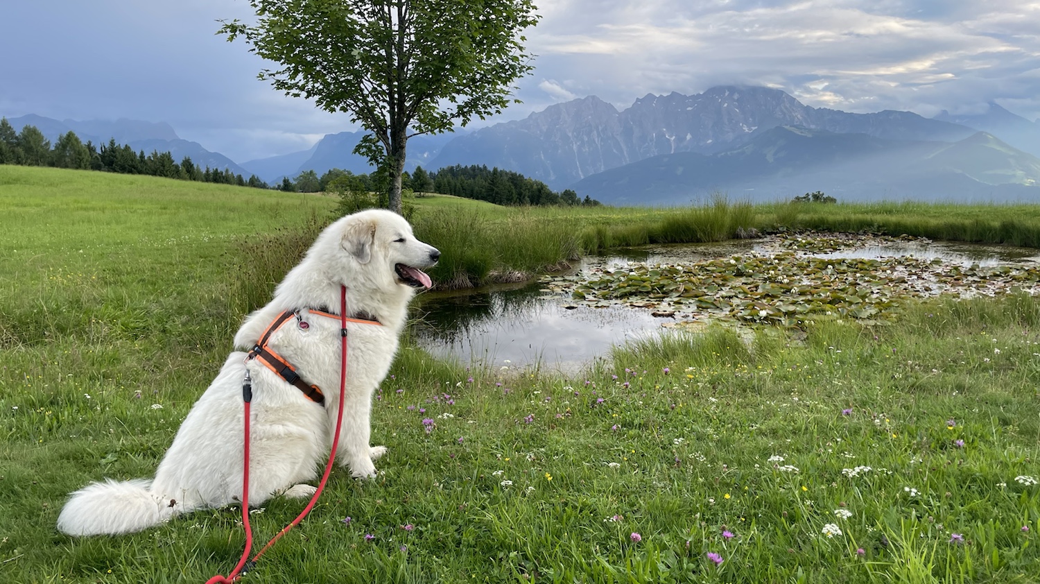 Aber da war dann so ein Rindviehch auf der Wiese und da mußten wir umkehren. Ich wäre ja weitergelaifen. Aber mein großer Mensch sagt, die Weiden gehören den Rindviehchern und da muß man lieb sein. Also sind wir zurück zum kleinen Weiher gelaufen und ich habe da noch mein Trockenfutter trockengefuttert. Dann sind wir zurück zum Ferienhaus gegangen.