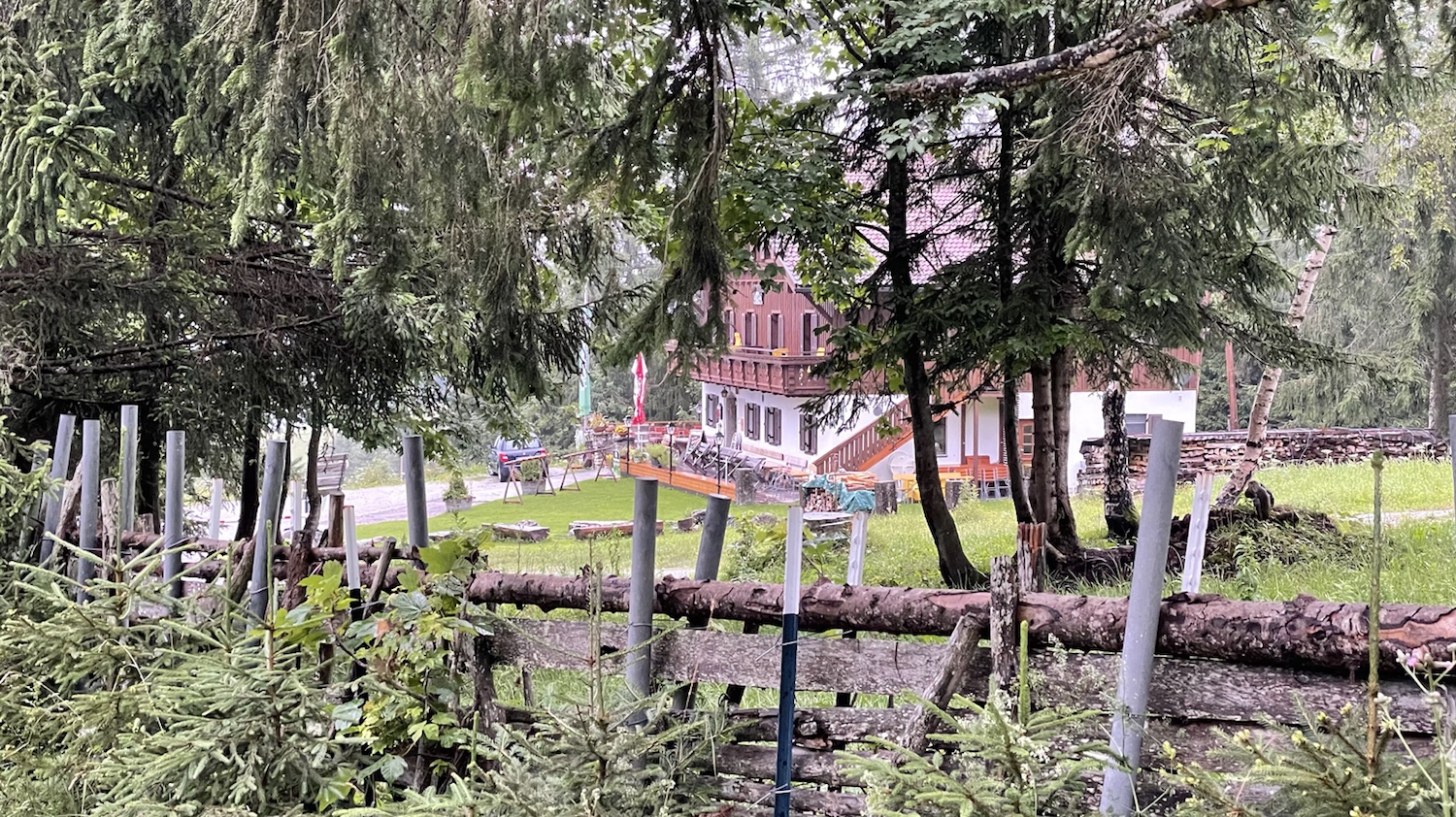 Nach dem Abendessen fängt es wieder an zu regnen. Trotzdem gehe ich noch eine Abendrunde mit Bella. Vorbei an den beiden Gaststätten gleich in der Nähe, dem „Zillreith“ und etwas weiter dem „Halleinerhaus“. Bella bleibt gleich im Hauseingang in ihrem Bademantel liegen. Da ist es für sie angenehm kühl.