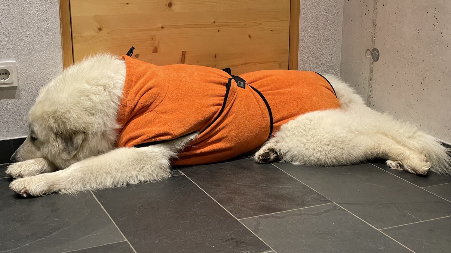 Es hat ganz sehr geregenwettert. Deshalb hat mein großer Mensch mich dann auch mit meinem Pyriprinzessinnentrockenrubbelhandtuch trockengerubbelt und mich dann in meinen orangenen Bademantel gesteckt. Ich bin gleich im Hauseingang geblieben und habe es mir da gemütlich gemacht. Dort ist es nämlich schön kühl. Und da habe ich schon mal geschlummert. Mein großer Mensch hat mich dann noch aus meinem Bademantel ausgewickelt.