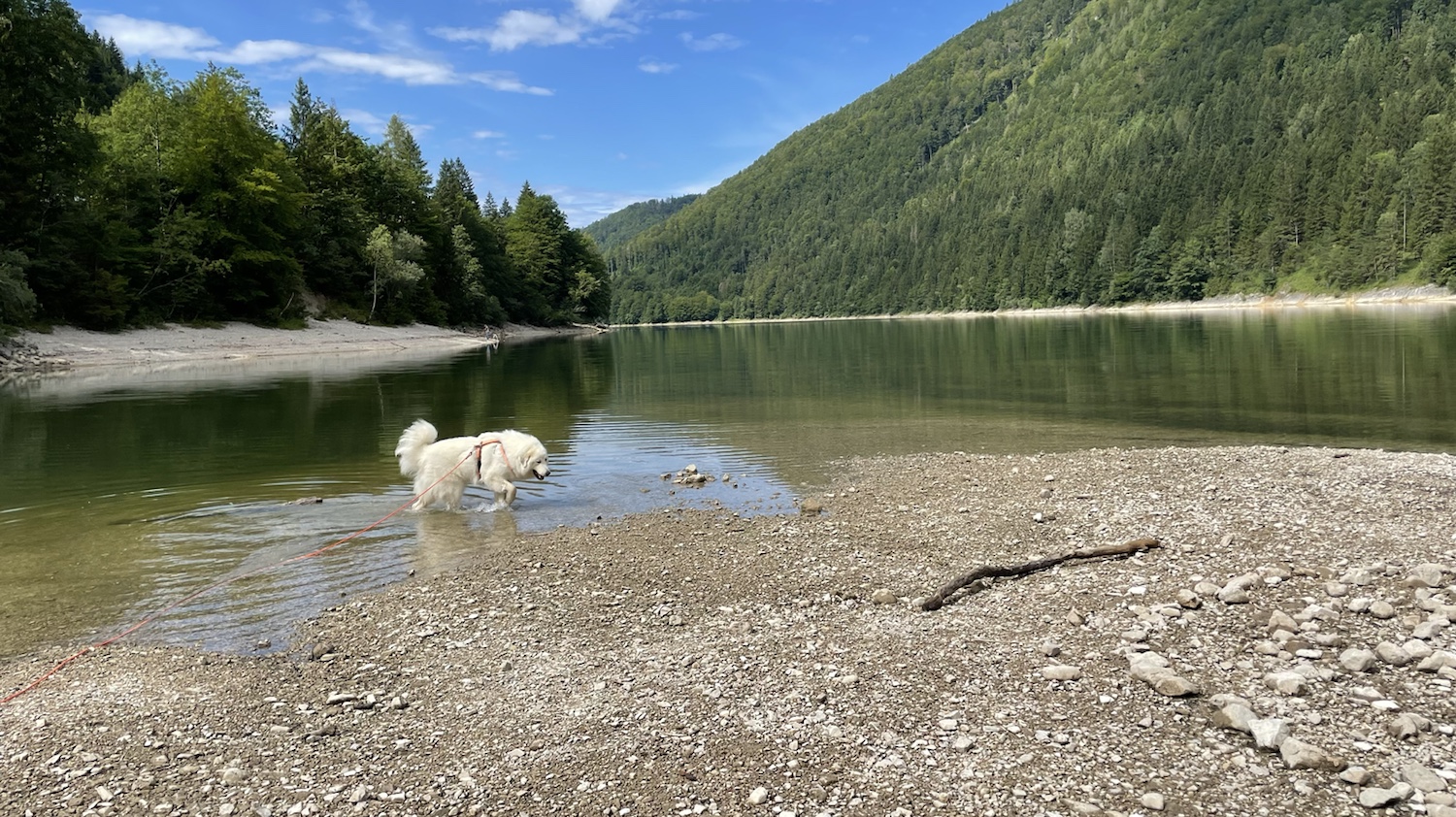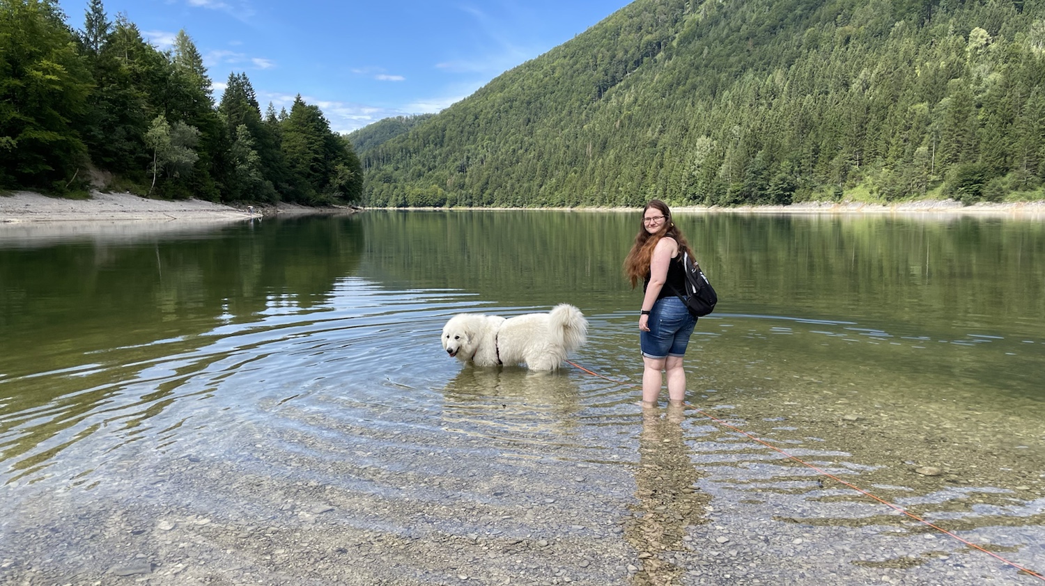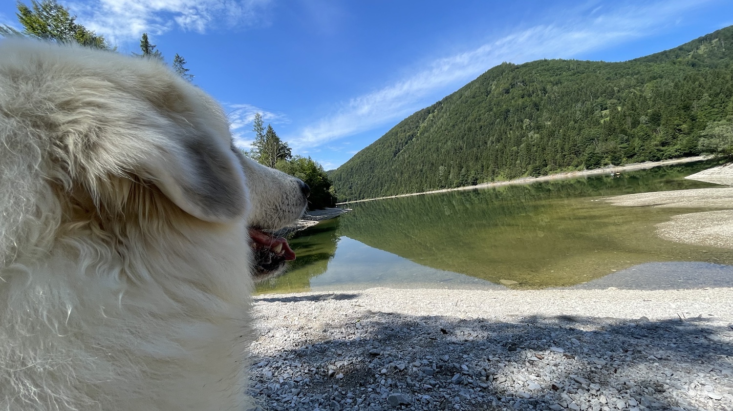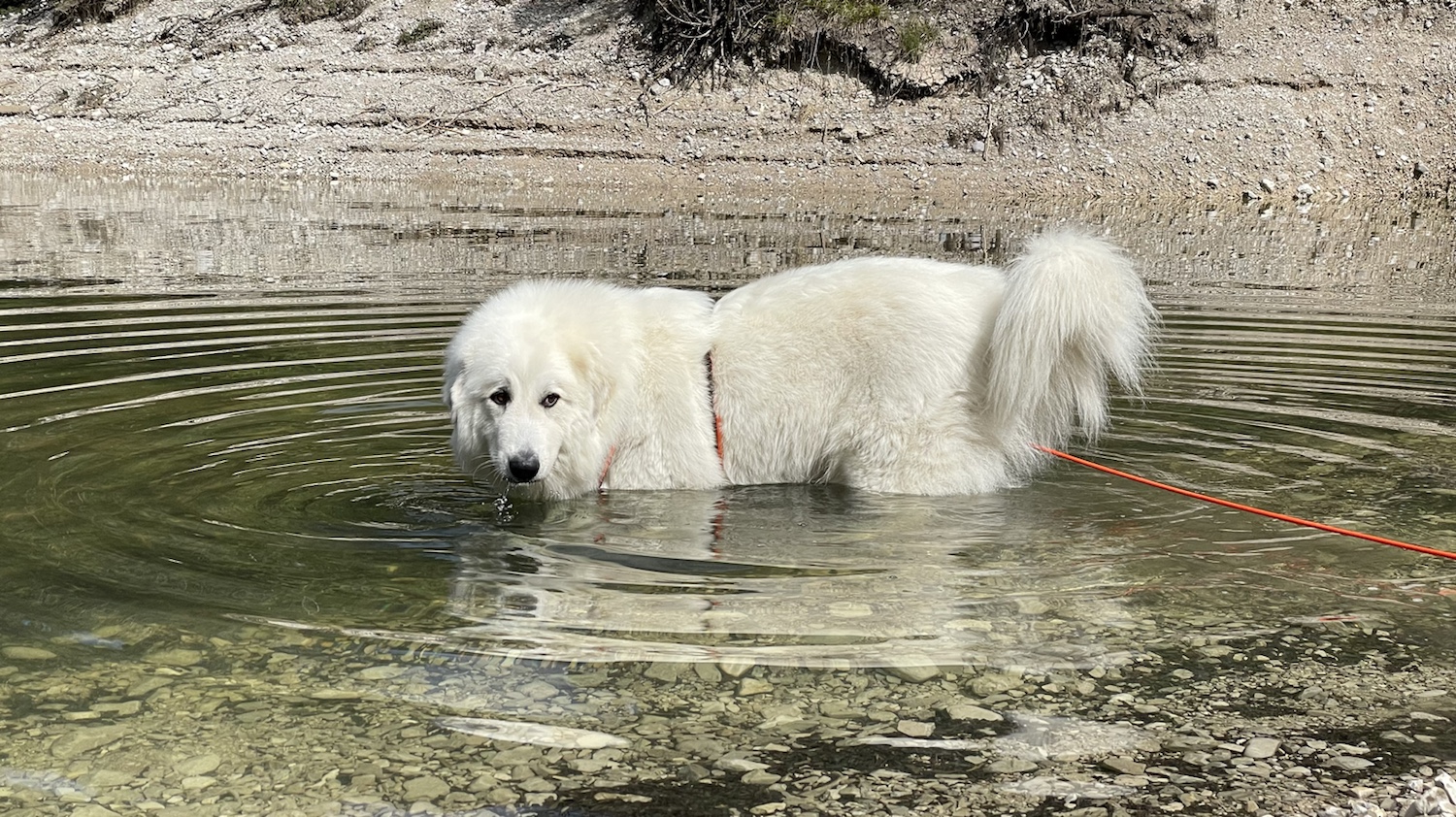Und da sind wir dann an einen riesigen Ozean gekommen. Die Menschen haben den Ozean Stausee genannt. Aber das war ein Ozean. Ein ganz schöner. Ich durfte auch gleich rein in das Wasser. Bis zum Pyribäuchlein war ich drin. Das genügt mir. Dann habe ich erstmal alles kontrolliert. Ich muß ja auf meine Menschen aufpassen. Das ist meine Aufgabe. Ich bin eine Herdenschutzhündin.