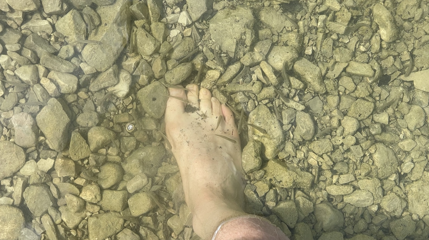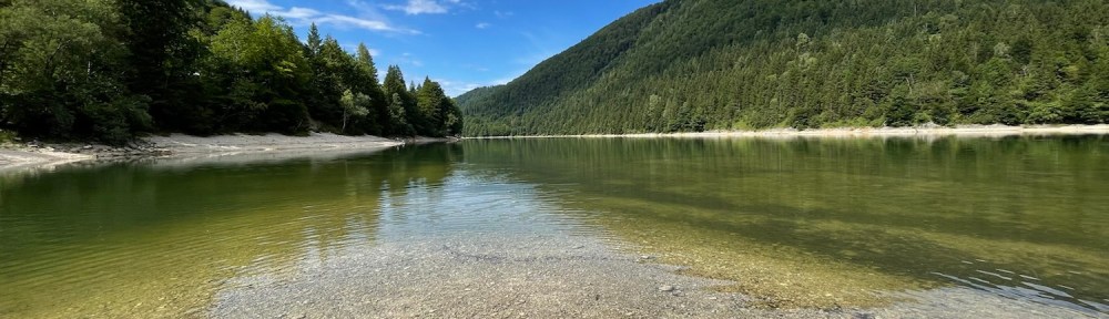 Eine traumhafte Landschaft, es geht ganz flach ins Wasser und dass ist deutlich wärmer, als wir es erwartet hätten. Vom Rand her kommt ein kleiner Wasserfall. Wir gehen zumindest mit den Füßen mal ins Wasser. Viele kleine Fische knabbern sofort an den Füßen. Wahrscheinlich „Alpine Schmelzwasserpiranhas“ oder sowas. Hat auf jeden Fall gekitzelt an den Füßen.