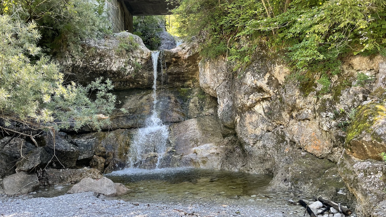 Wir sind dann an einem kleinen Wasserfall gewesen. Da konnte ich am Rand auf den Felsen rumklettern. Und dann habe ich einen schönen Platz gefunden, wo ich alles überblicken konnte. Da habe ich mich mit meinem großen Mensch hingesetzt.