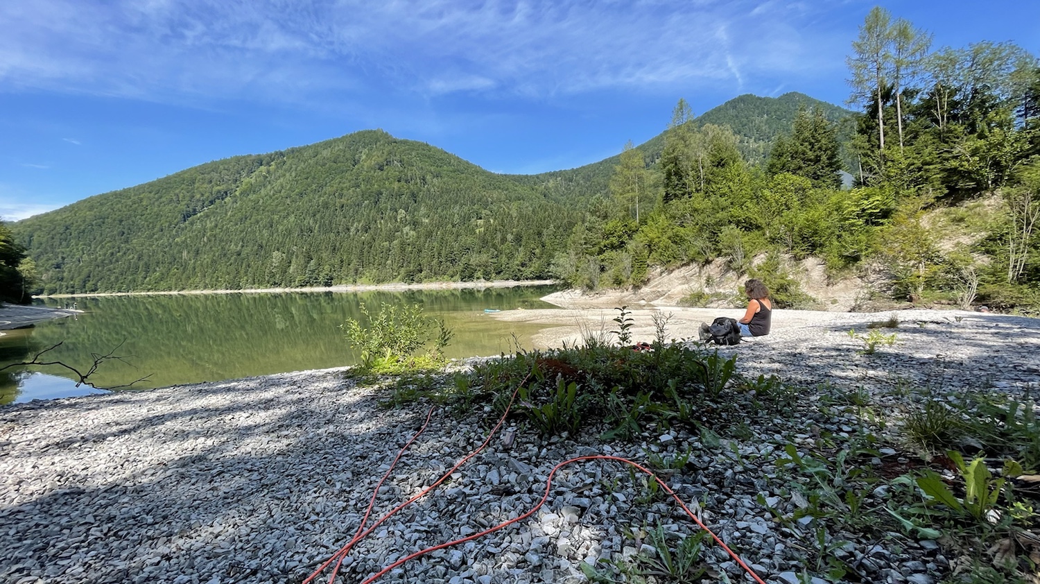 Wir haben es uns dann am Ufer gemütlich gemacht und die Ruhe genossen. Bella ist, wie es sich für eine Berghündin gehört, geklettert und hat sich dann einen ruhigen Platz gesucht, von dem aus sie das gesamte Gelände, den See und ihre Herde im Blick hat, um sofort reagieren zu können, sobald eine vermeintliche Gefahr droht.