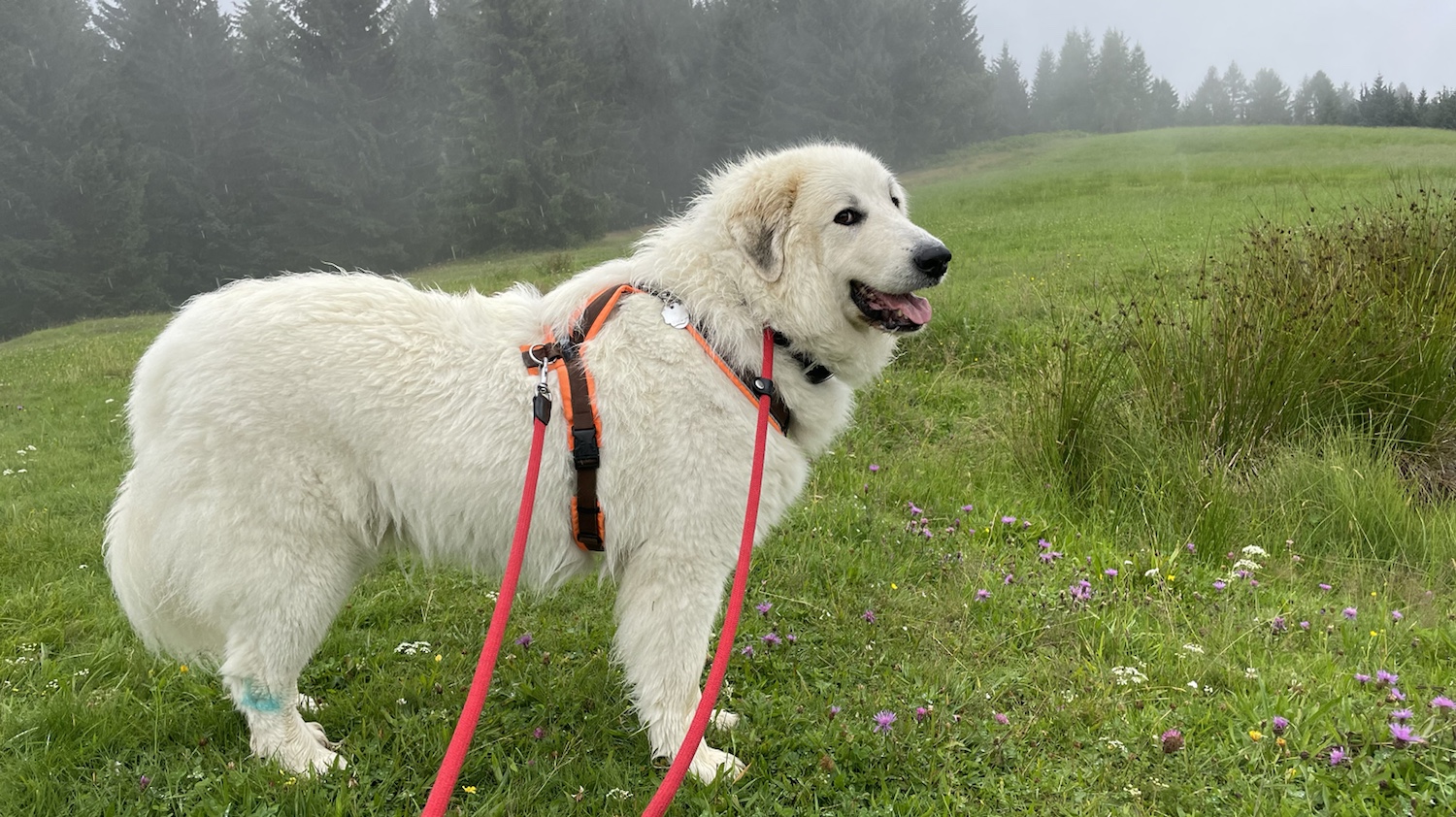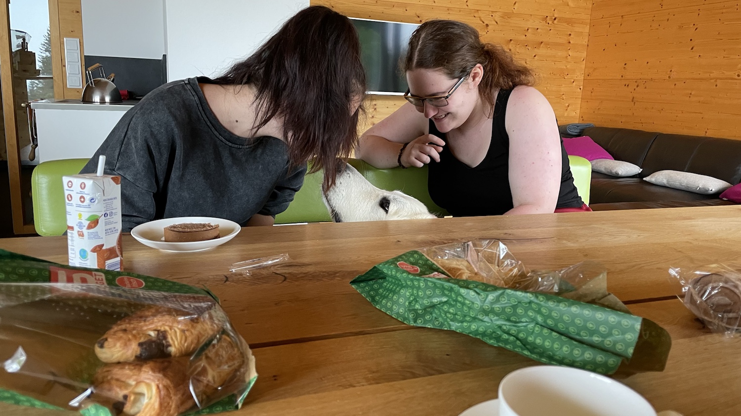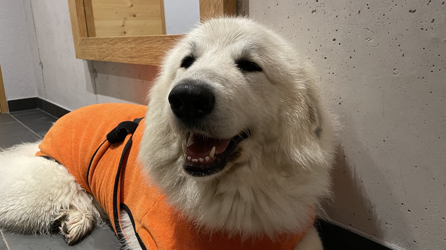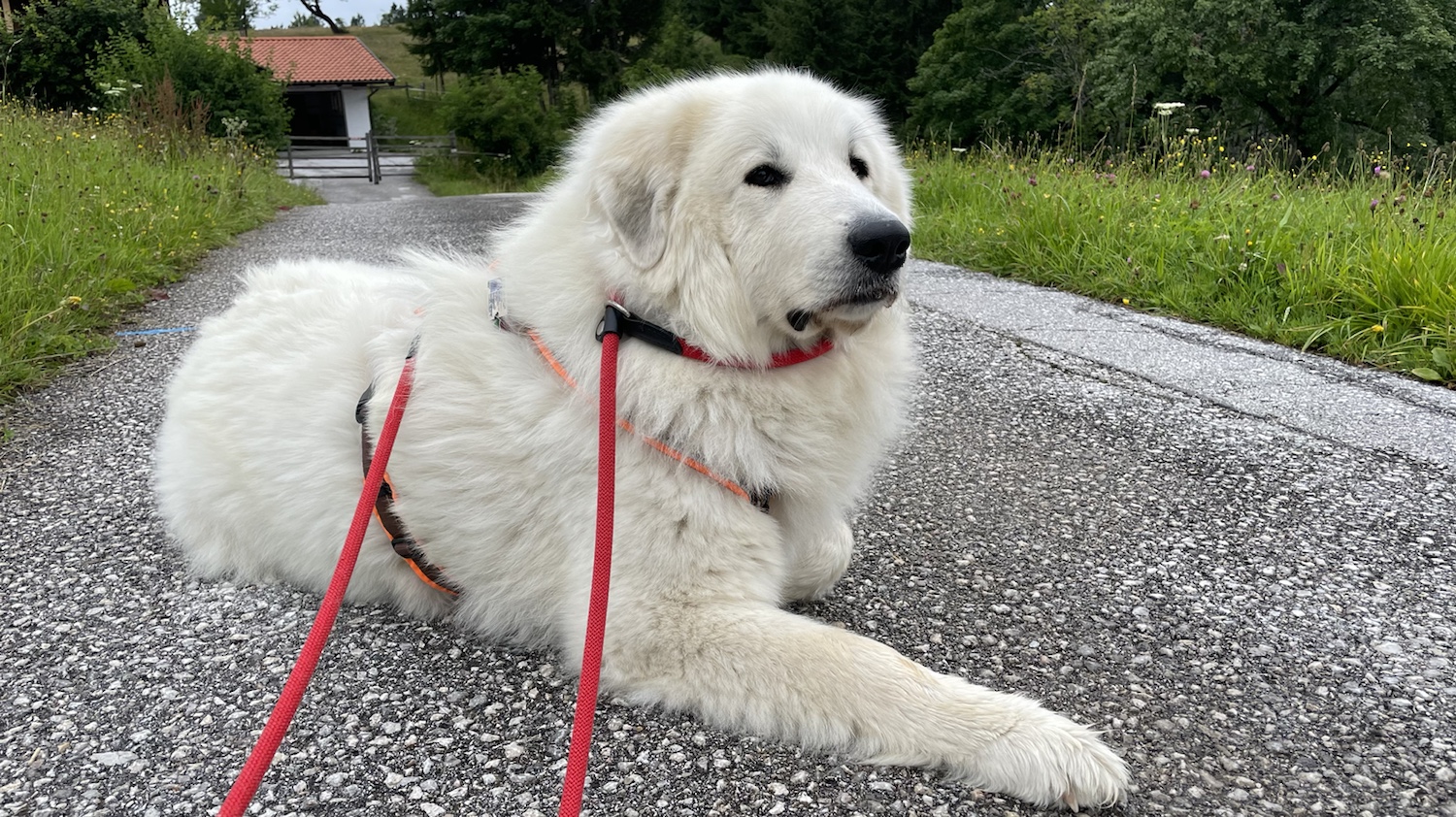 Ich bin gleich unter den Tisch gekrabbelt und habe mich schön ausgeruht. Meine Menschen haben gefuttert. Bis alles alle war. Und dann sind wir weitergewandert. Bis zu unserem Ferienhaus. Da wohnt die Bella nämlich jetzt. Im Österreich. Auf dem Berg. Ich bin eine Berghündin! Eine Pyrenäenberghündin! Jawoll!