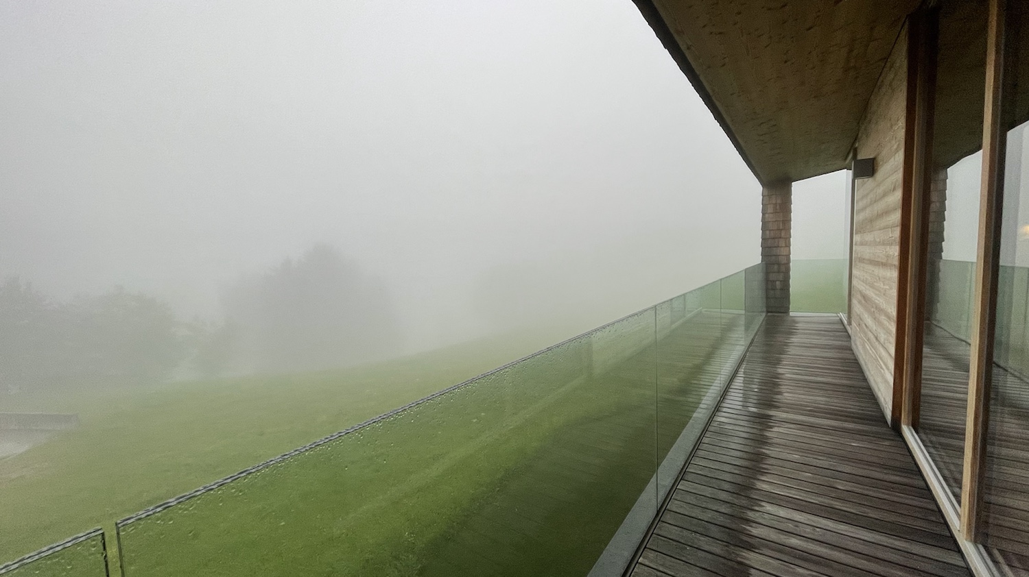 Wieder im Ferienhaus trockne ich erstmal Bella ab. Die Pyri trocknet in ihrem Bademantel und ich verdrücke mich in die Sauna. Draußen regnet es, unser Haus ist von Wolken umringt.