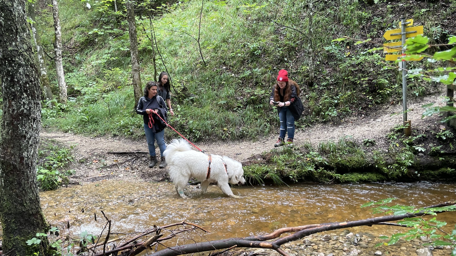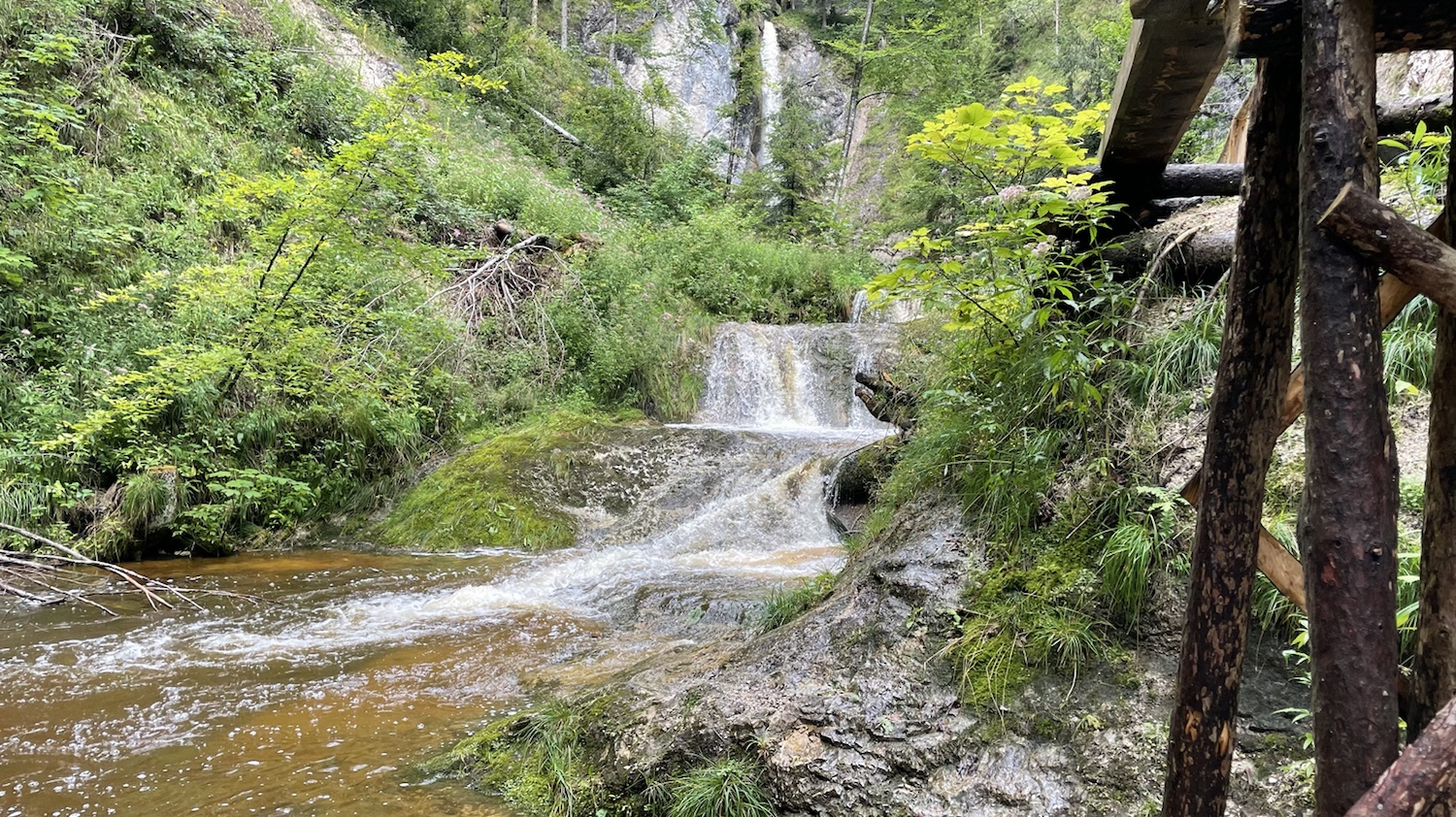 Am Bächlein sind wir dann immer weiter gewandert, bis zu einem Holzhaus. Das heißt Mühle. Und von da haben wir dann das Wasser gesehen. Das ist vom Berg runtergefallen. Die Menschen sagen dazu Wasserfall. Wasser kann nicht klettern, wie Berghunde. Deshalb fällt es den Berg runter. Kann man sich ganz einfach merken.