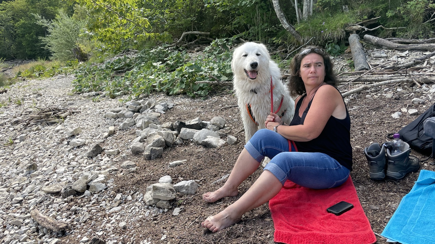 Am Westufer finden wir einen kleinen Steinstrand in dem es kurz flach ins Wasser geht, bevor es dann gleich richtig tief wird. Bella stürzt sich sofort ins Wasser und entdeckt am Nachbarstrand, der durch eine kleine Bucht von uns getrennt ist einen weiteren Hund.