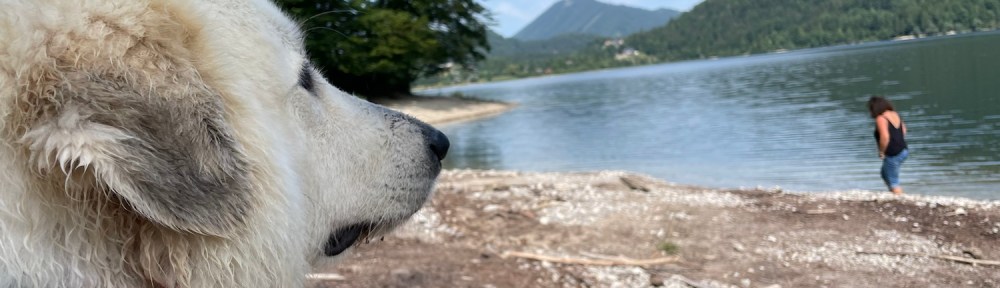 Heute bin ich wieder mit meinen Menschen in meinem weißen französianischen Auto weggefahren. Zu einem Ozean. Der hieß inter dem See obwohl der ja der See ist. Und ein Ozean. Das ist komisch. Aber es war ganz schön dort. Wir sind um den ganzen See herumgelaufen. Und gleich am Anfang ist die Bella mal was trinken gewesen. Aber baden durfte ich da nicht, weiiil, die Seite vom See ist nur für die Menschen.