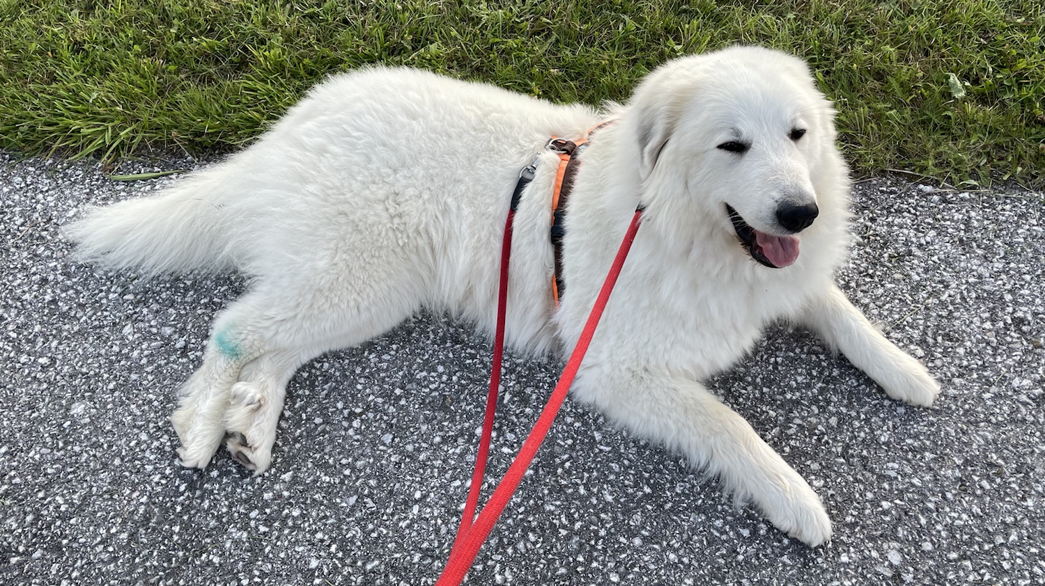 Nach dem Abendessen dann wieder Abendspaziergang hinter dem Ferienhaus. Bella futtert wieder und macht es sich auf der kleinen Straße gemütlich bis wir wieder zurück zum Haus laufen.