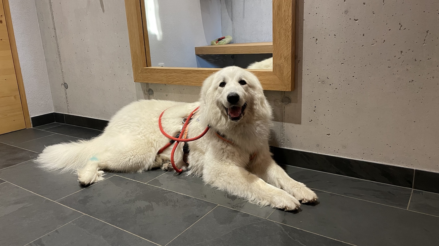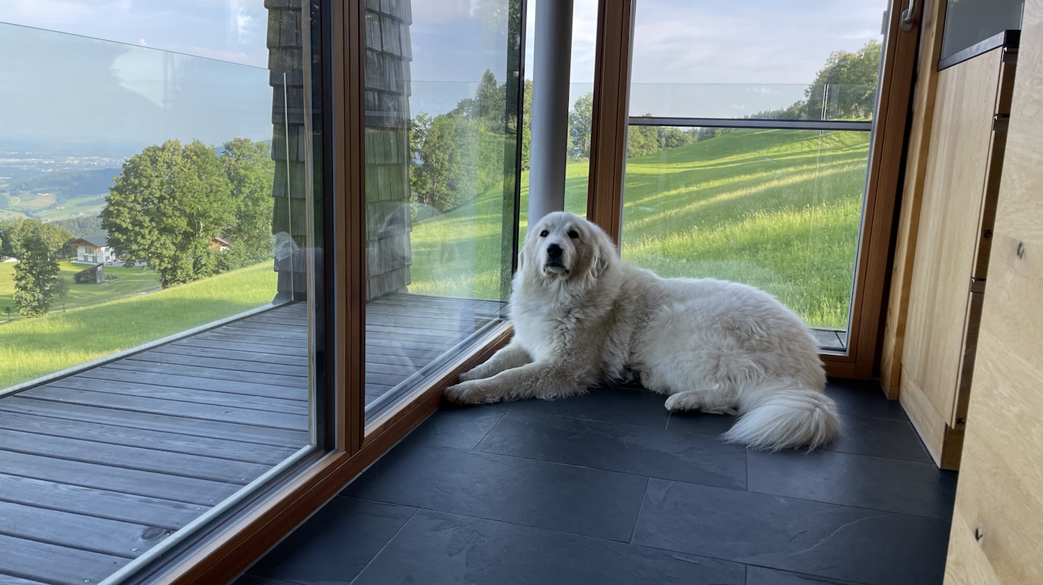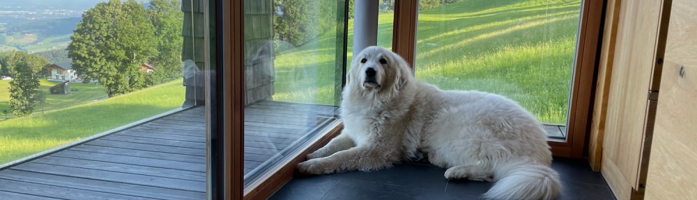 Die Bella hat wieder ganz lange ausgeschlummert. Heute, an ihrem letzten Urlaubstag in den Bergen. Dann gab es Frühstücksfutter. Aber ich hatte gar keinen großen Hunger. Ich bin wieder aufgeregt, weiiil, morgen macht die Bella doch wieder eine große Reise. Nach Hause.