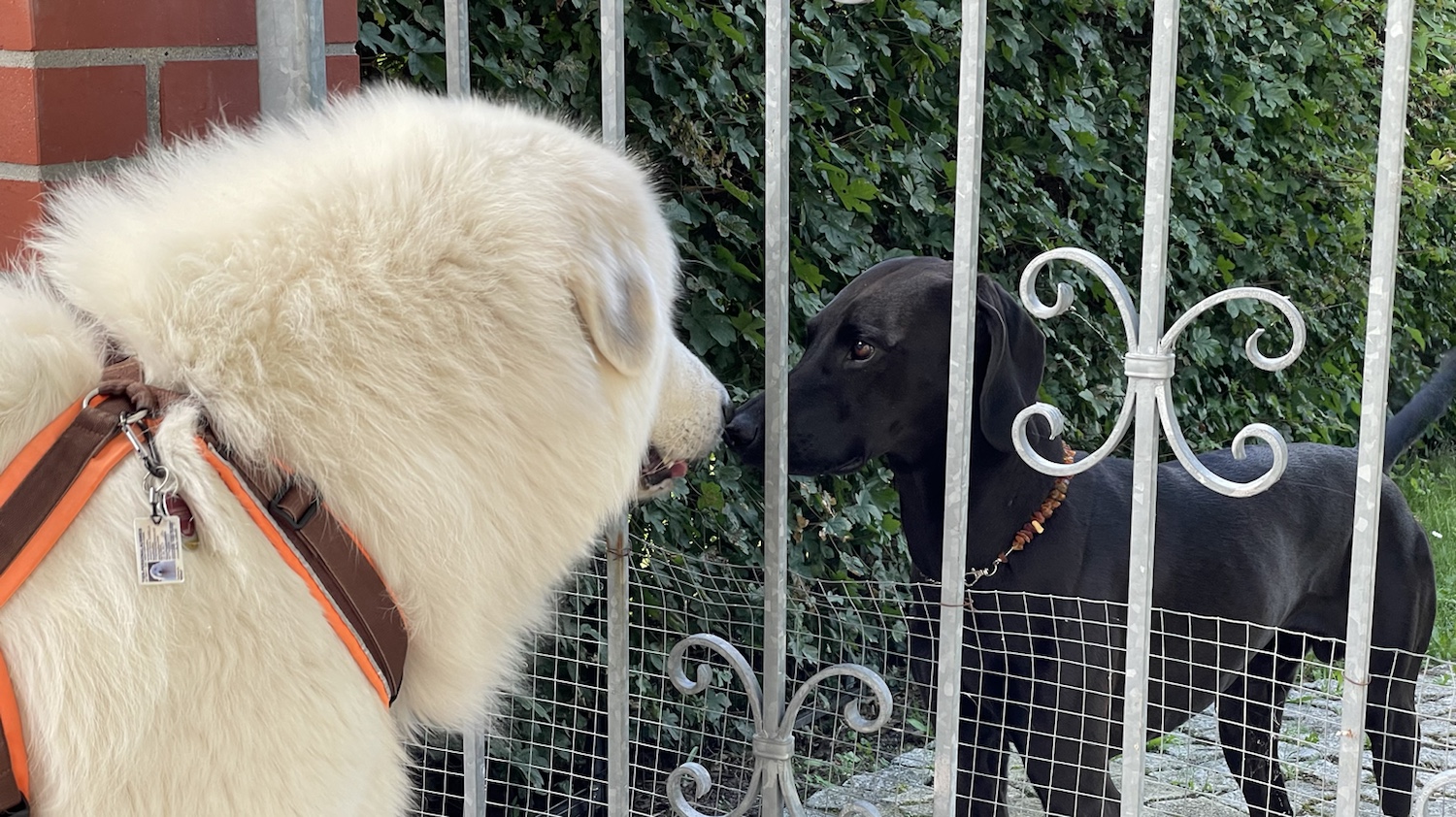 Wir sind dann aus dem Wäldchen raus und zurück durch die Siedlung, immer im Zick-Zack. Da haben wir zwei Hunde getroffen. Einen Jungen, der war nicht angeleint und ein Mädchen, viel kleiner als ich, aber die hat mich angezickt. Da war ich schon auch aufgeregt.