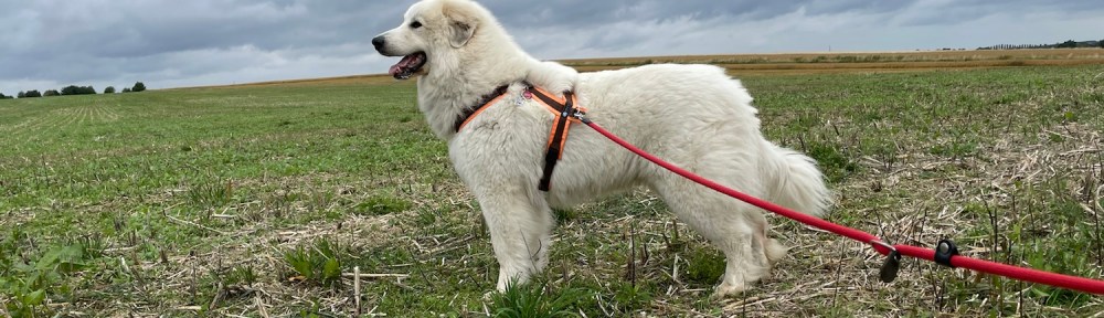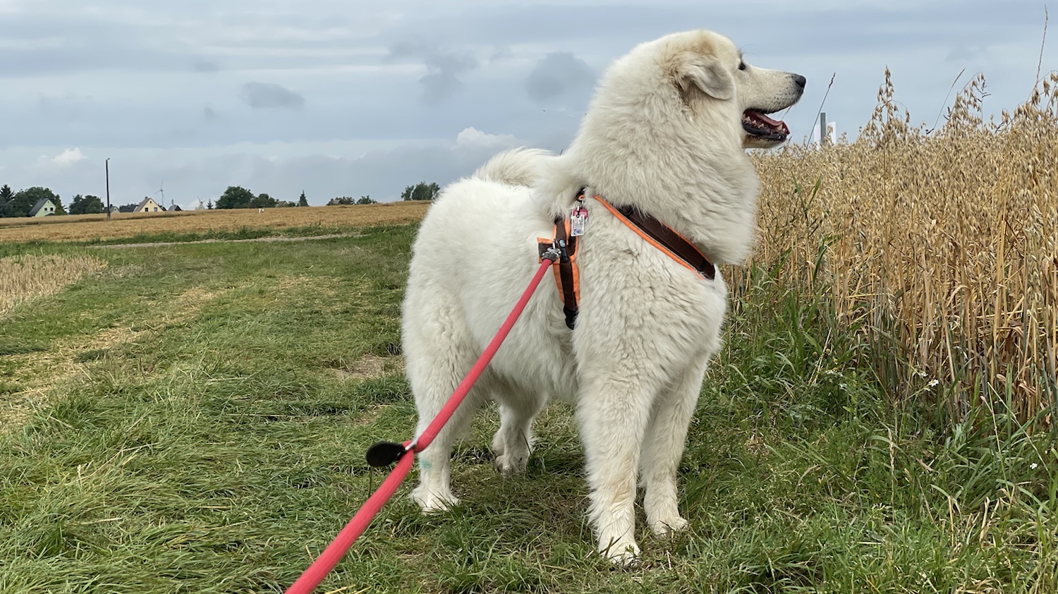Am Freitag war die Woche dann wieder richtig in Ordnung. Ich bin nach dem Frühstücksfuttern mit meinem großen Mensch spazieren gegangen. Zum großen Feldweg. Und dann weiter auf dem kleinen Feldweg zur großen Wiese. Über die sind wir dann drüber gelaufen zu meiner großen Feldwiese.