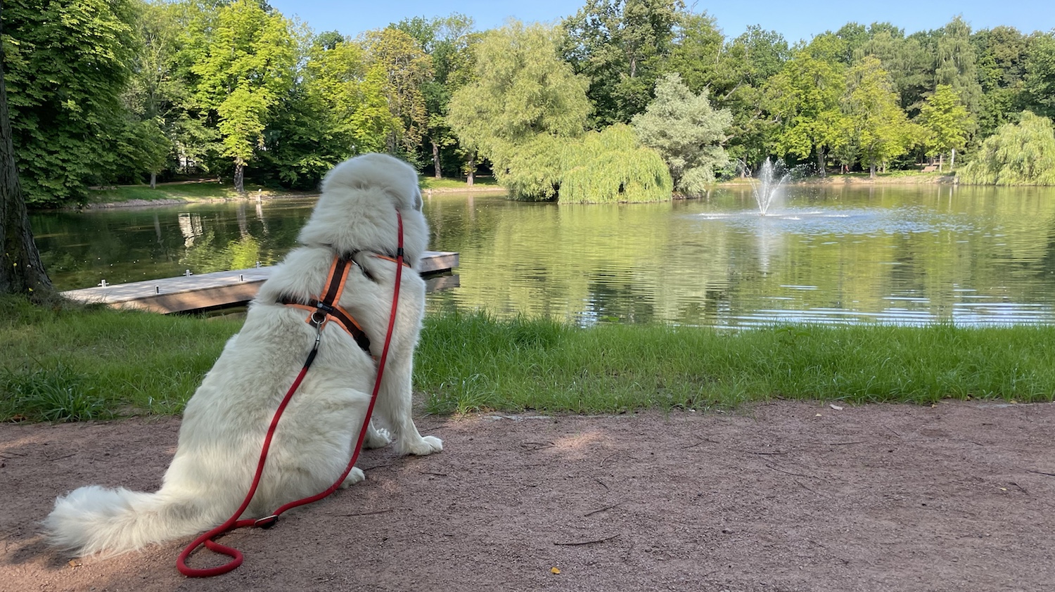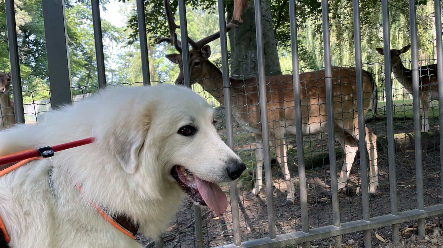 Wir sind um den ganzen Ozean herumgelaufen. Von überall konnten wir guggen. Über den großen Ozean. Den Teich. Und dann sind wir zu den Rehen gekommen. Die sind nicht vor der Bella fortgelaufen. Und wir haben uns am Zaun beschnuffelt. Das große Reh hate ganz viele Hörner auf seiner Rübe. Die heißen Geweih. Und das Reh heißt Hirsch. Hirsch Hubert. Sagt mein großer Mensch. Den Hirsch Hubert gibt es hier schon ganz lange, sagt mein großer Mensch. Aber dieser Hirsch Hubert ist ganz neu. Aber der originale Hirsch Hubert hieß auch schon Hirsch Hubert. Seit über hundertmillionenmilliardenundmehr Jahren heißt der Hirsch hier Hirsch Hubert. Oder noch länger. Auf jeden Fall schon immer. Sagt mein großer Mensch.
