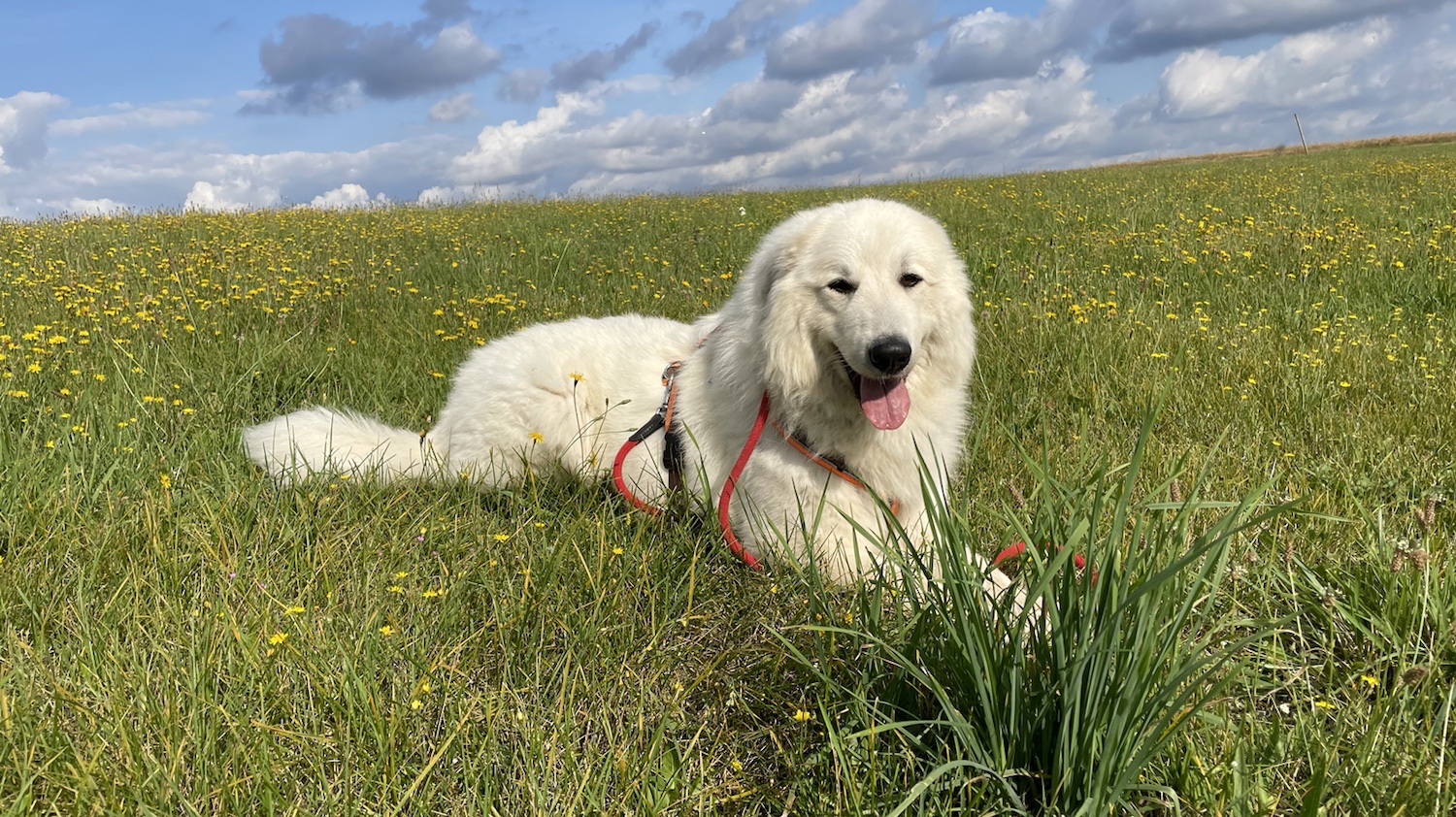 Wir sind dann am Waldrand lang zur Wiese und da hat mich mein großer Mensch gebürstet. Ich verliere doch gerade so viel Fell. Meine ganze weiche, warme Unterwolle geht raus. Und ich habe mir heute selbst Fell rausgerupft. Da ist jetzt ein Loch. Das finden meine Menschen gar nicht gut. Aber das hat so gekrabbelt.