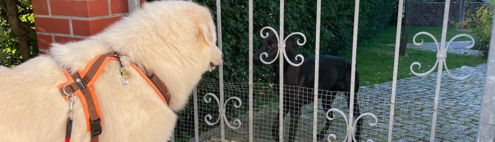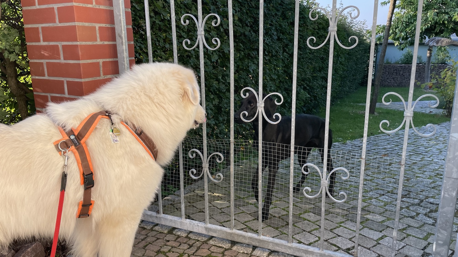Meinen Abendspaziergang haben wir heute wieder durch die Siedlung gemacht. Und auch meine große Menschenschwester ist wieder mitspaziert. Und heute war auch der Aaron mal wieder in seinem Garten und da konnte ich den meiner großen Menschenschwester zeigen.
