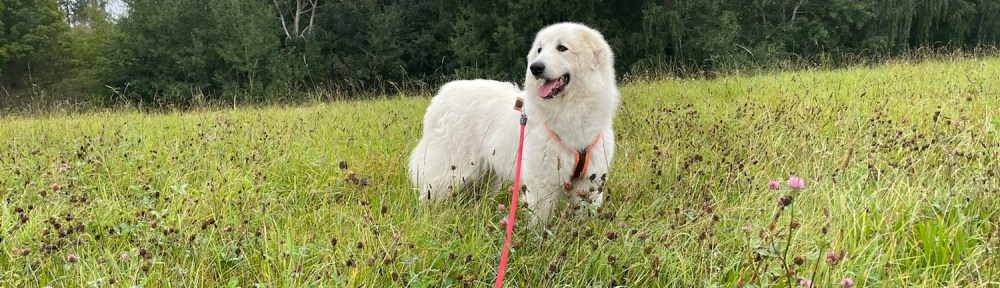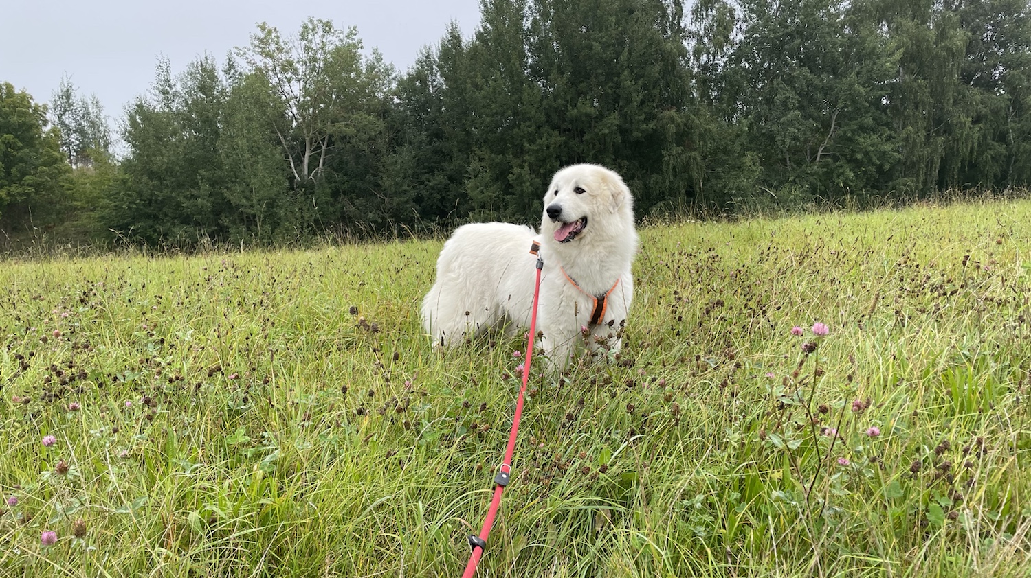 Dann sind wir wieder nach Hause gelaufen. Über die große Wiese hinter meinem Wohngebiet. Mein großer Mensch wollte eigentlich einen anderen Weg gehen, aber ich wollte über die große Wiese. Und weil die Bella so lieb war, durfte ich da auch langgehen. Und auf dem Weg dahin haben mich wieder zwei Hunde ganz wild angeschimpft. Ich war aber da auch ganz lieb. Habe nur ganz grimmig geguckt.