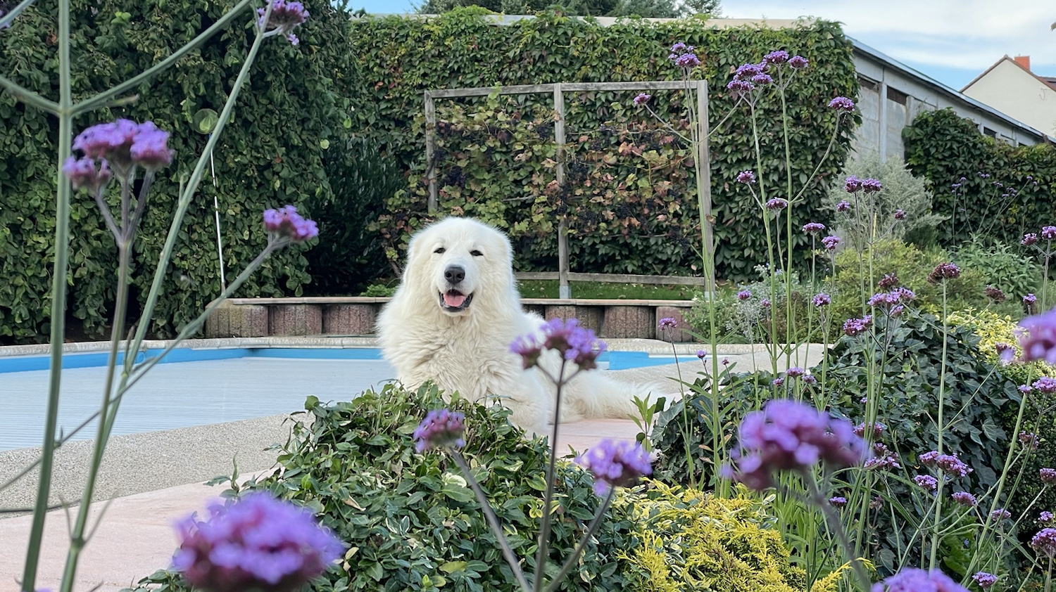 Zu Hause habe ich mich erstmal ausgeruht. Und nachmittags bin ich wieder in meinem Garten gewesen. Da habe ich mich an meinen Pool gelegt, weiiil, da habe ich meine Ruhe, denn da kommt der freche Rasenhund nicht hin. Hahahahaaa, die Bella ist schlau!
