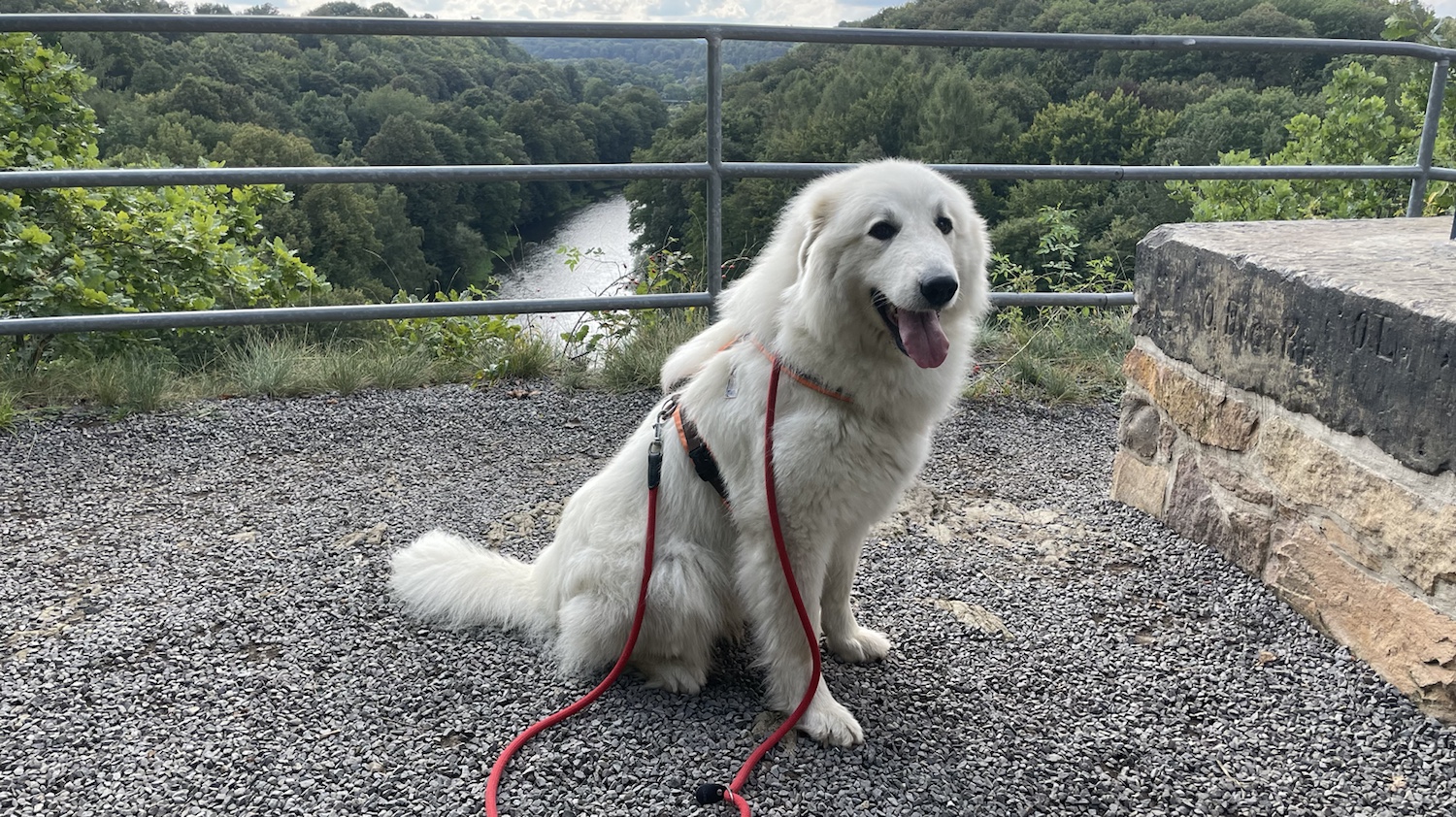 Wir sind erstmal ein ganzes Stück die Straße lang und da gab es ganz viel zu schnuffeln. Dann ging es weiter ein Stück durch den Wald und dann am Waldrand lang über ein Feld und wieder in den Wald und dann waren wir auf einem großen Felsen und von dem konnte man auf den großen Fluß mit dem komischen Namen gucken – Tschooo-Pauuu!