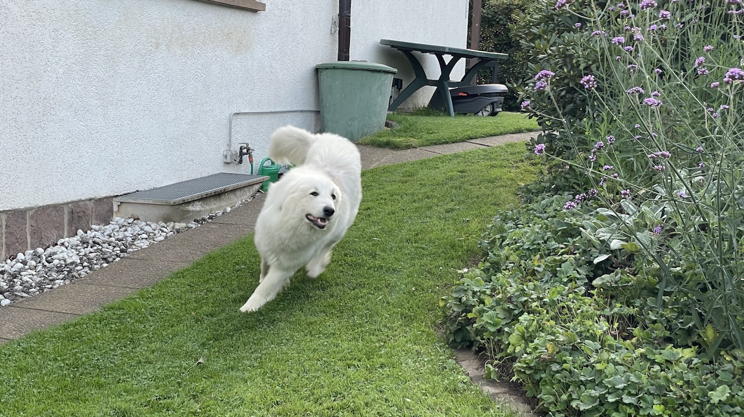 Ich bin dann wieder mit meinem großen Mensch nach Hause gefahren. Da habe ich mich schön ausgeruht. Zuerst in meinem weißen französianischen Auto, auf der Fahrt, und dann in meinem Garten, zu Hause. Vor meinem Abendspaziergang bin ich ein paar Runden durch meinen Garten geflitzt. Vor Freude! Die Bella kann nämlich auch ganz schnell sein!