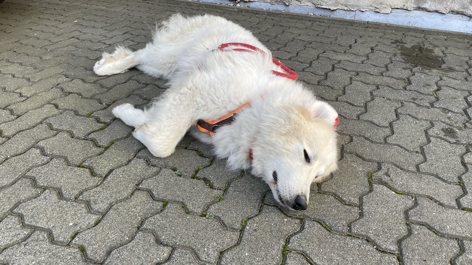 Und heute war das Tor dort geöffnet. Und da konnte ich mich schön ausruhen. Wie sich das gehört. Ich mache immer eine Pause. Heute habe ich mein Trockenfutter gefuttert und was getrunken. Meine kleine Menschenschwester ist dann nach Hause gegangen. Ich habe mich weiter ausgeruht.
