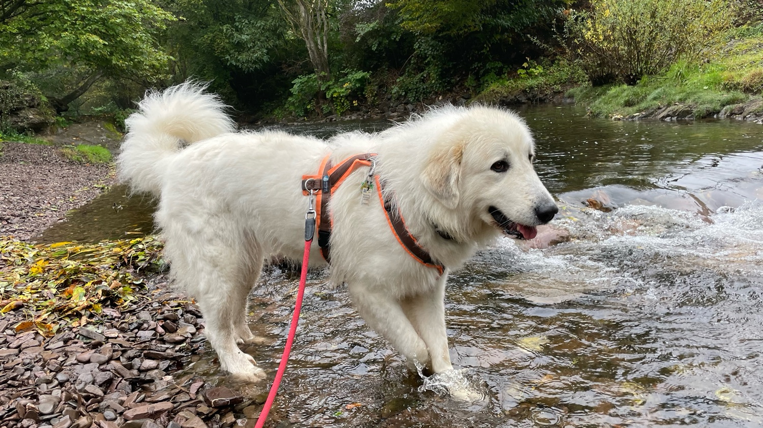Dann sind wir wieder auf dem Radweg am Alfbach gewesen und da sind wir den ganzen Weg langgelaufen und ich durfte heute auch mal in den Alfbach reingehen. Da habe ich Wasser getrunken und meine Pfötchen gekühlt.