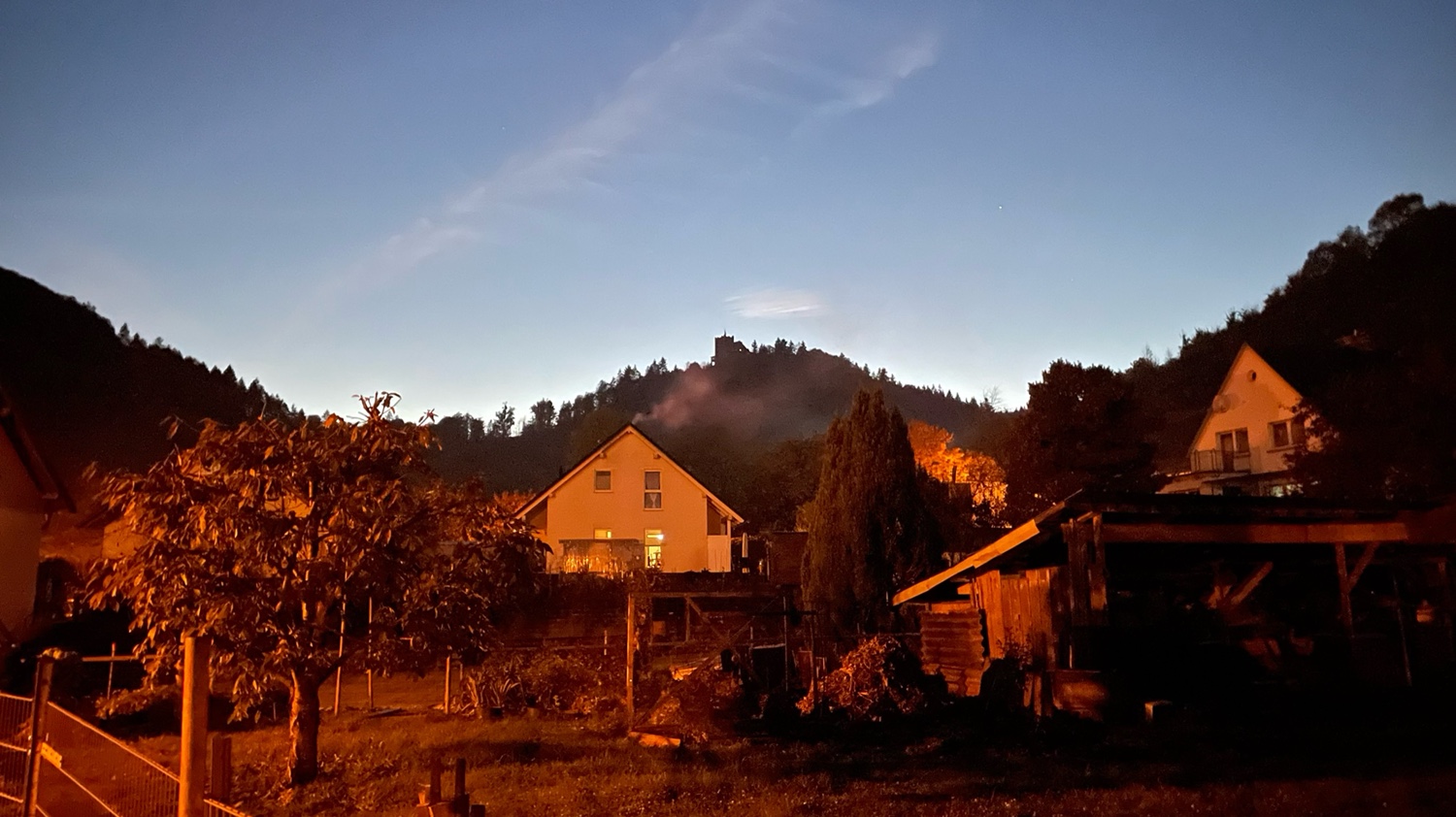 Und durch Regenwolken. Das große Haus auf dem Berg haben wir da auch wieder gesehen. Burg Arras.