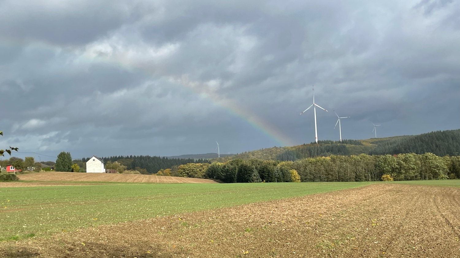 Auf dem Rückweg war nicht nur ein ganz sehrer Pustewind, nööö, da hat es dann auch noch geregenwettert. Das war ekelig. Aber wir sind trotzdem wieder zu unserem Parkplatz mit meinem weißen französianischen Auto gelaufen. Und da haben wir einen Regenbogen gesehen.