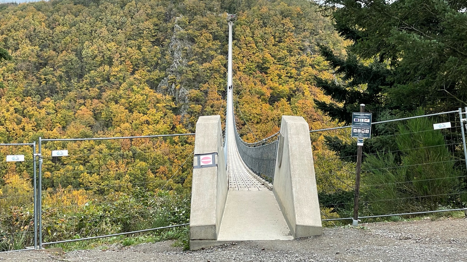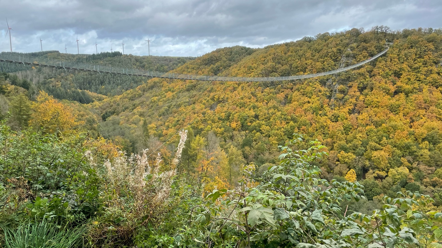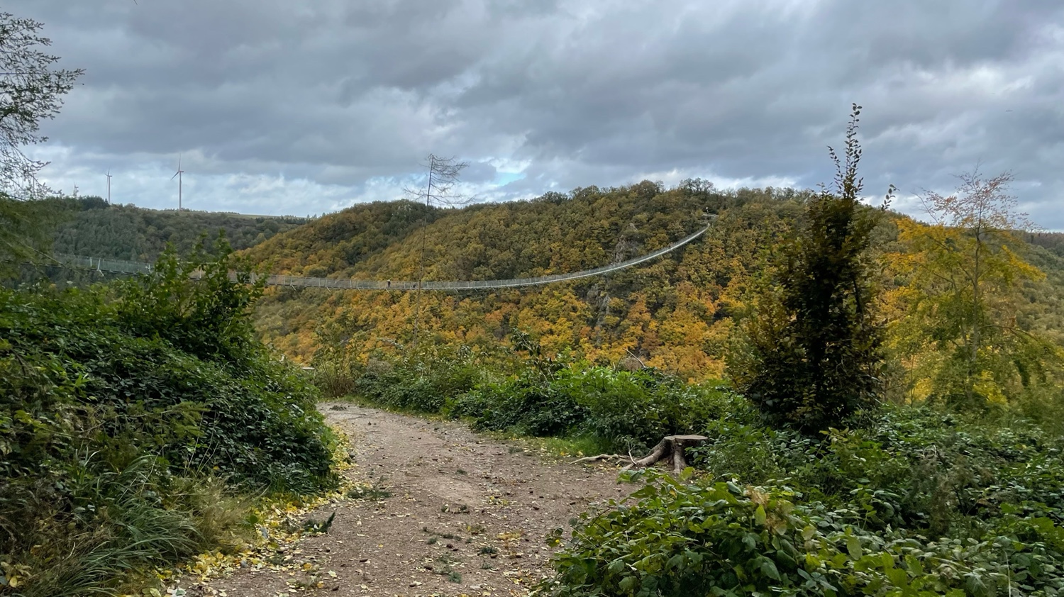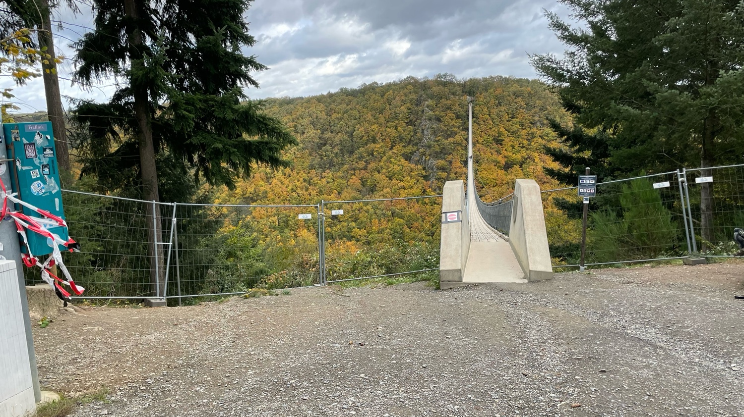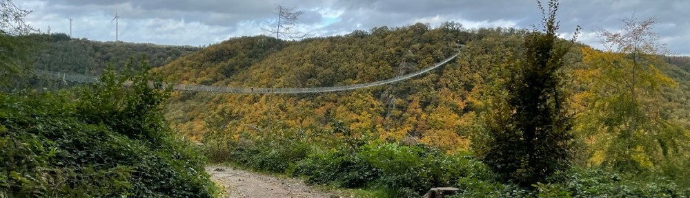Und nach fast zwei Kilometern sind wir dann an der Brücke gewesen. Eine ganz riesengroße. Eine Hängeseilbrücke. Da durfte man aber nur von der anderen Seite aus drüberlaufen. Aber mein großer Mensch kann da sowieso nicht drübergehen. Der ist ein Höhenängstling. Und so haben wir nur geguggt.